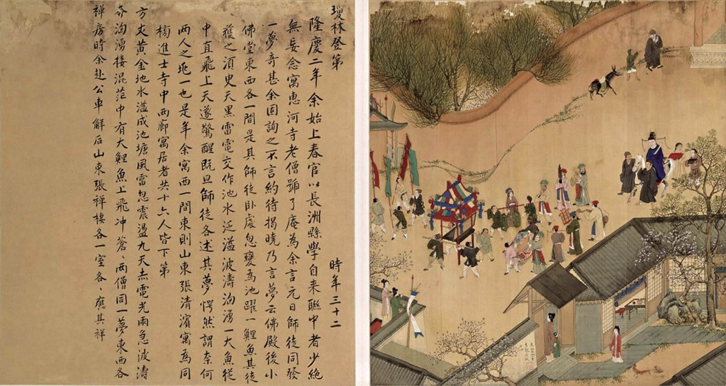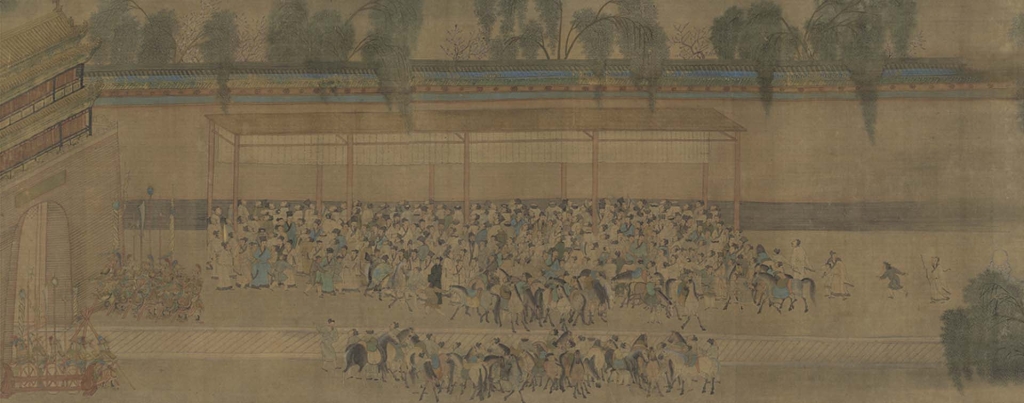 傳為仇英所繪的〈觀榜圖〉描繪科舉最高層級的「殿試」後,考生爭相觀榜以及皇宮內舉行相關慶典禮儀等情景。畫前半段是觀榜處,外圍人馬雜沓,懸榜處人潮洶湧,眾人抬頭看榜,搜尋自己的名字,有人氣定神閒,冷眼旁觀,也有人神色惶然,確定高中者則興奮登馬而去;失意不得志者神情沮喪,由旁人攙扶,頹然而返等細節,呈現科舉桎梏下的人生百態。