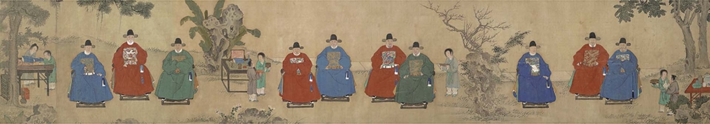 北京故宮博物院藏〈甲申十同年圖〉,是幅畫卷描繪明弘治十六年癸亥(1503)三月二十五日十位高官聚會情景,地點在閔珪(1430-1511)府第。根據卷後序跋,與會十人皆是朝中重臣,為天順八年甲申(1464)的同榜進士。與會者年齡以閔珪最大,74歲,李東陽(1447-1516)57歲,年紀最小。此圖當時共畫十本,十位成員各留一本。此卷是閔家所傳,清嘉慶十五年(1810)間為法式善(1753-1813)收藏,是目前僅存的孤本,為重要的歷史文獻。學者認為,明代高官舉行雅集,與前代文人雅集多有不同,這類同年高官雅集圖之繪製,多有彰顯地位與政績之意,題跋中也不乏對當朝盛世與明君的讚美。