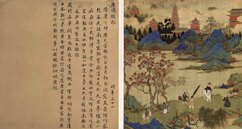 與「同年」相關者,則有所謂的鹿鳴文化,「鹿鳴」本是《詩經.小雅》的篇名,共有三章。根據〈詩序〉:「鹿鳴,燕群臣嘉賓也。」首章二句為:「呦呦鹿鳴,食野之苹。」昔時鄉舉考試放榜之後,由州縣長官宴請主考官、學政以及得中舉人的宴會,因在宴會上歌詠〈鹿鳴〉,稱為「鹿鳴宴」,而參與科舉考試者皆稱「鹿鳴客」。上述《徐顯卿宦跡圖》第四開「鹿鳴徹歌」即是關於鹿鳴宴之紀錄,不過有趣的是,由於徐顯卿當時要赴京城趕考,因此未能參加鹿鳴宴,圖中所描繪的是他與翔鸞廟道士辭別的情景。