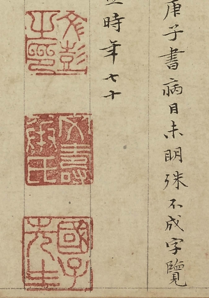 有關文彭最棘手的問題,還是代表作品的真實面貌(註7)。他的篆刻原作存世極少,張灝(1618年舉人)在萬曆年間《承清館印譜》收有文彭印19方,但這些印章同樣受到質疑。至於篆刻史最常使用的幾方名印:「琴罷倚松玩鶴」(圖1,西泠印社藏)、「七十二峰深處」(圖2,上海博物館藏)、「畫隱」(圖3,上海博物館藏),也都不斷受到學界質疑。經過學者們努力研究搜索,逐漸發現一些可信的傳世印拓,例如上海圖書館藏《文三橋詩稿冊》的15方鈐印(註8),屬於早中期三、四十歲的作品,就印章本身刻治的精美程度判斷,可能都是出於工匠之手,無法確認是否文彭親為。