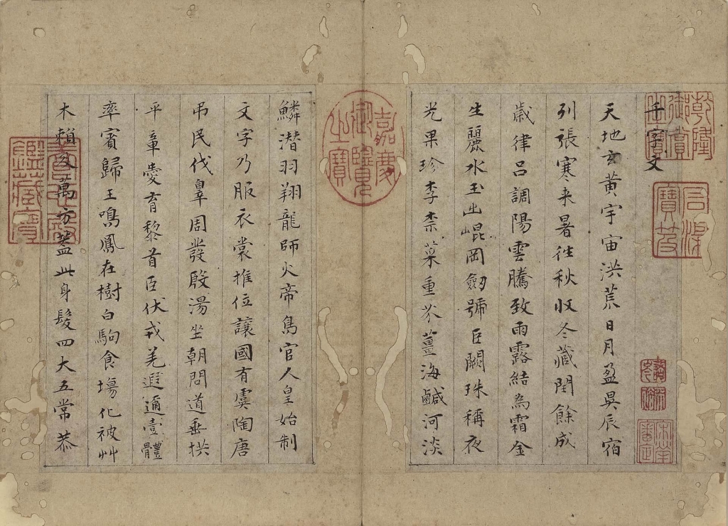 《文三橋詩稿冊》中的「文彭之印」,同樣也是他終其一生都在使用的印稿,傳世幾方印呈現出些微差距(見表2)。值得注意的是此印風格剛好介於中間,帶著裝飾性的篆書。文彭69歲書的〈書千文〉(圖6),使用三方印:「文彭之印」、「文壽承氏」、「國子先生」,從表2中不難看出「文彭之印」與《文三橋詩稿冊》上的非常接近,只是69歲時所蓋的反而有框且印文清楚,年代早的不僅缺框且殘缺更多。