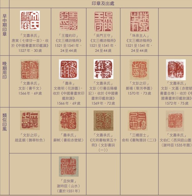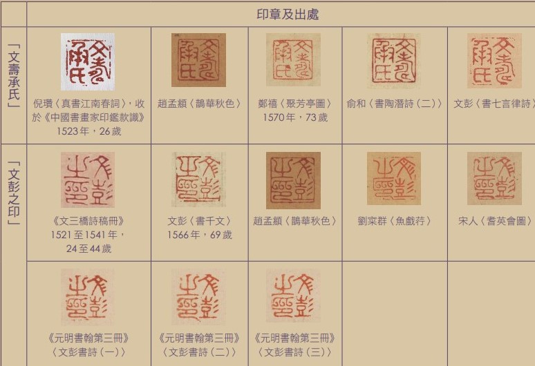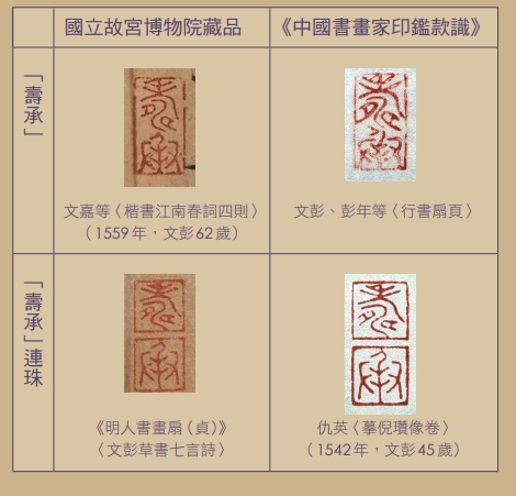 文彭親刻印章面目為何,向來是篆刻界最為關心的議題,許多研究者也都睿智地把眼光投向其本人的書畫用印,甚至親朋好友,然而終究難以落實。年紀小文彭將近40歲的王穉登(1535-1614)在〈金一甫印譜序〉中回憶:「余少有印癖,匣中尚多壽承之作,每一展玩,嘆其絕倫。」周應愿《印說》談到文彭「間篆印,興到或手鐫之,卻多白文,唯『壽承』朱文印,是其親筆,不衫不履,自爾非常。」此段文獻因為提到文彭親自篆刻而經常被引用,似乎成為解密其印章的關鍵,文物出版社《中國書畫家印鑑款識》(1996版)頁161中即收錄編號13「壽承」及15「壽承」連珠印,只是印章較小,不是十分清楚(表1)。