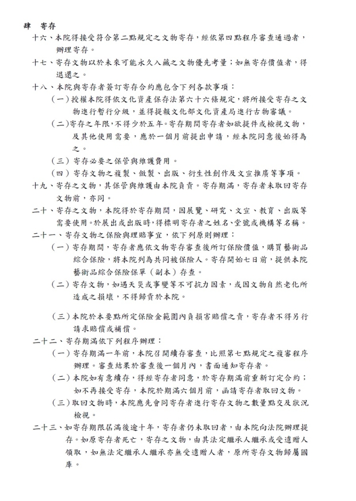 首先「寄存文物以於未來可能永久入藏之優先考量」成為新的前提,避免產生寄存文物退還、領回爭議。而故宮得以在獲得寄存者授權後,依文化資產保存法第六十條規定,將所接受寄之物進行暫分級,並得提報文化部資產局古審議。