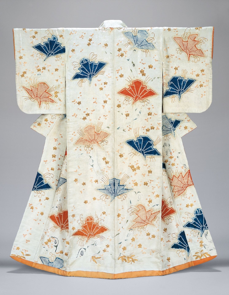例如,〈白綸子地梅文熨斗蝶模樣打掛〉上所裝飾的「熨斗蝶」,乃是紙折成的蝴蝶。據當時的書籍記載,兩隻蝶和諧飛舞的模樣,讓蝶成為夫妻圓滿的象徵,因此依此製作出熨斗蝶。目前存世尚有與本件圖樣幾乎相同的〈梅樹熨斗蝶模樣振袖〉(女子美術大學美術館藏),是一件圖案相同但有著茶、紅、白不同顏色的三領打掛。所謂的「打掛」,是當時富裕的市民、富有的農民等在婚禮上所使用的「三つ揃い」(三件套)。將寓意夫妻圓滿的熨斗蝶作為婚禮服裝的圖案似乎很受歡迎,帶有類似圖案的打掛也傳到了海外。