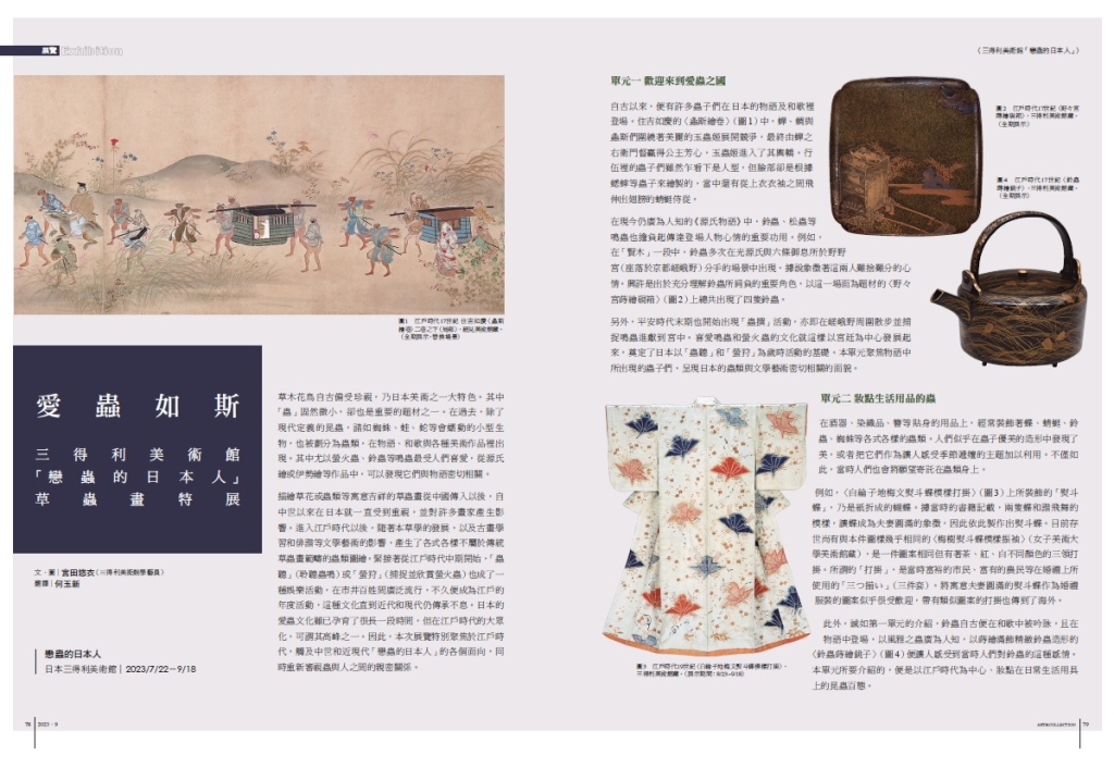 此外,誠如第一單元的介紹,鈴蟲自古便在和歌中被吟詠,且在物語中登場,以風雅之蟲廣為人知,以蒔繪滿飾精緻鈴蟲造形的〈鈴蟲蒔繪銚子〉便讓人感受到當時人們對鈴蟲的這種感情。本單元所要介紹的,便是以江戶時代為中心、妝點在日常生活用具上的昆蟲百態。