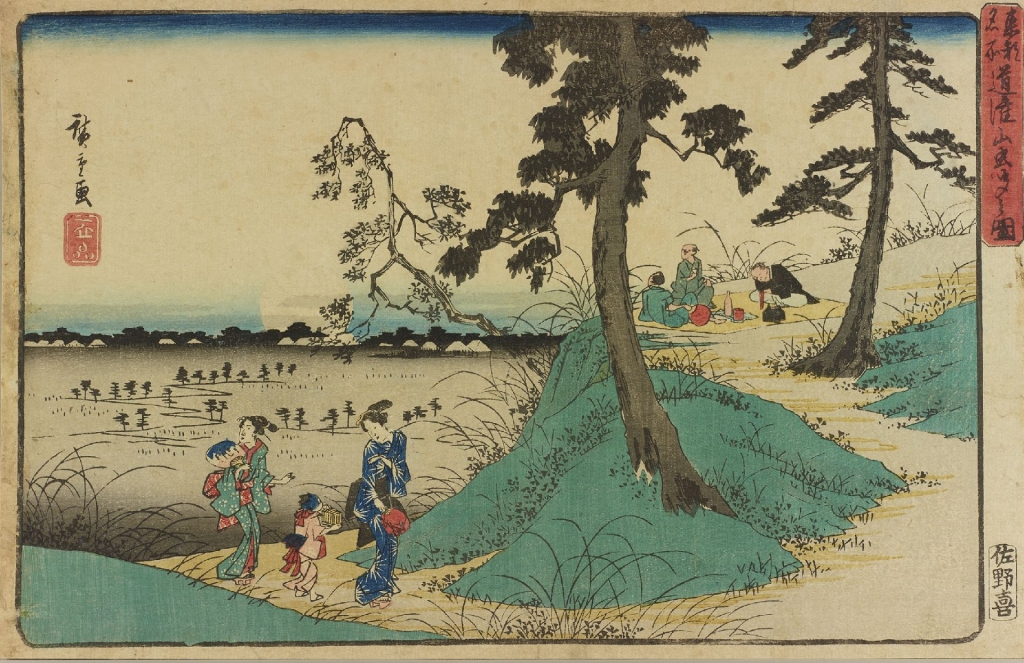 喜愛蟲鳴的文化,主要孕育自宮廷,及至江戶時代中期,入野山聆聽蟲鳴的「蟲聽」以及在黃昏時追捕螢火蟲的「螢狩」等,則成了市井百姓喜愛的風雅娛樂。江戶的道灌山(今東京都荒川區)和根岸(今東京都台東區)是著名的「蟲聽」和「螢狩」勝地,歌川廣重的〈東都名所 道灌山蟲聞之圖〉等作品便表現了男女老少結伴而出、盡情享受的模樣。這件錦繪中,描繪了給母親看蟲籠的孩子,以及在山丘上鋪著蓆子、享用酒水的男人們等。