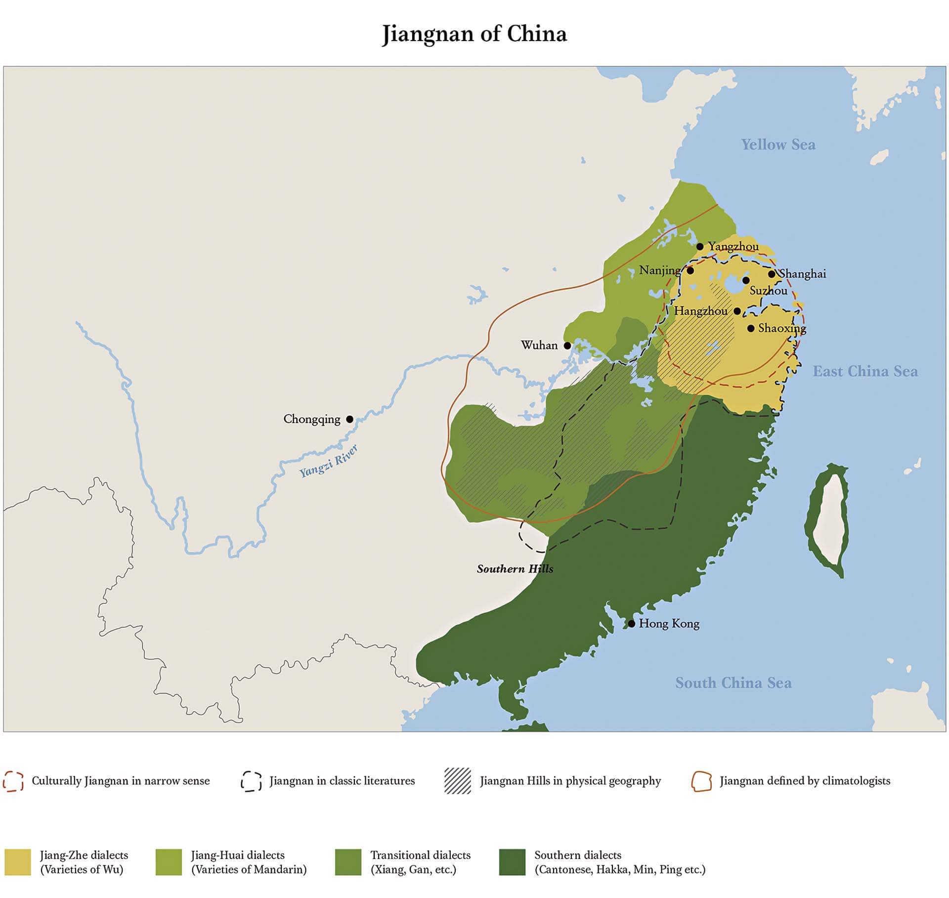 從地理上來看,江南的邊界一直不斷在變動。雖然對江南邊界的定義至今仍有爭議,但該地區的核心是從上海沿著長江向西延伸至今天的江西省廬山,範圍涵蓋部分的江蘇省、安徽省、浙江省。在唐宋以前,江南的地理與文化範圍有時更廣闊,從淮河到西邊的湖北、湖南與江西,以及南方的福建省。到了唐代,江南被劃分為不同道,東道包含現代的蘇州、杭州、南方的福建省。西道則延伸至現代的江西、湖南,以及部份的湖北與安徽。在十世紀,南唐的領土也被稱為江南。而在清代,「江南」則變成省分的名稱,涵蓋現代的安徽、江蘇地區,並以南京作為省府。