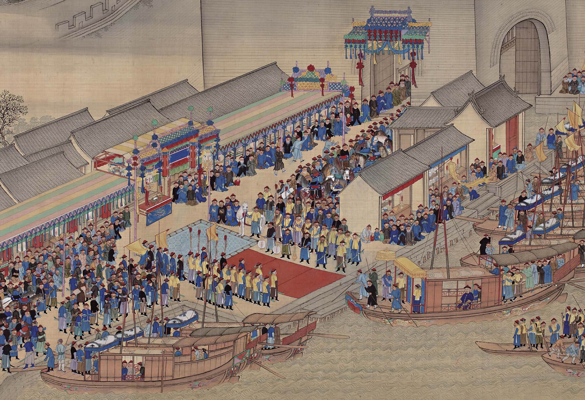 本展的「必看展件」是一幅25公尺長的手卷,畫卷上描繪了康熙帝(1662-1722在位)1689年第二次下江南,一路從北京沿著大運河到江南的情形。這卷畫借自加拿大阿爾伯塔大學美術館(Alberta University Art Museum),難得展出。它是一套十二幅畫中的一幅,細緻記錄了帝王從無錫到蘇州的出行細節。皇帝的圖像是整卷畫中的亮點。乘坐於船中的皇帝,正準備從閶門下船以騎上他的馬。官員與居民排滿街道。皇帝指定他出巡時「一切照常」,使得街道圍滿想一睹聖容的人。