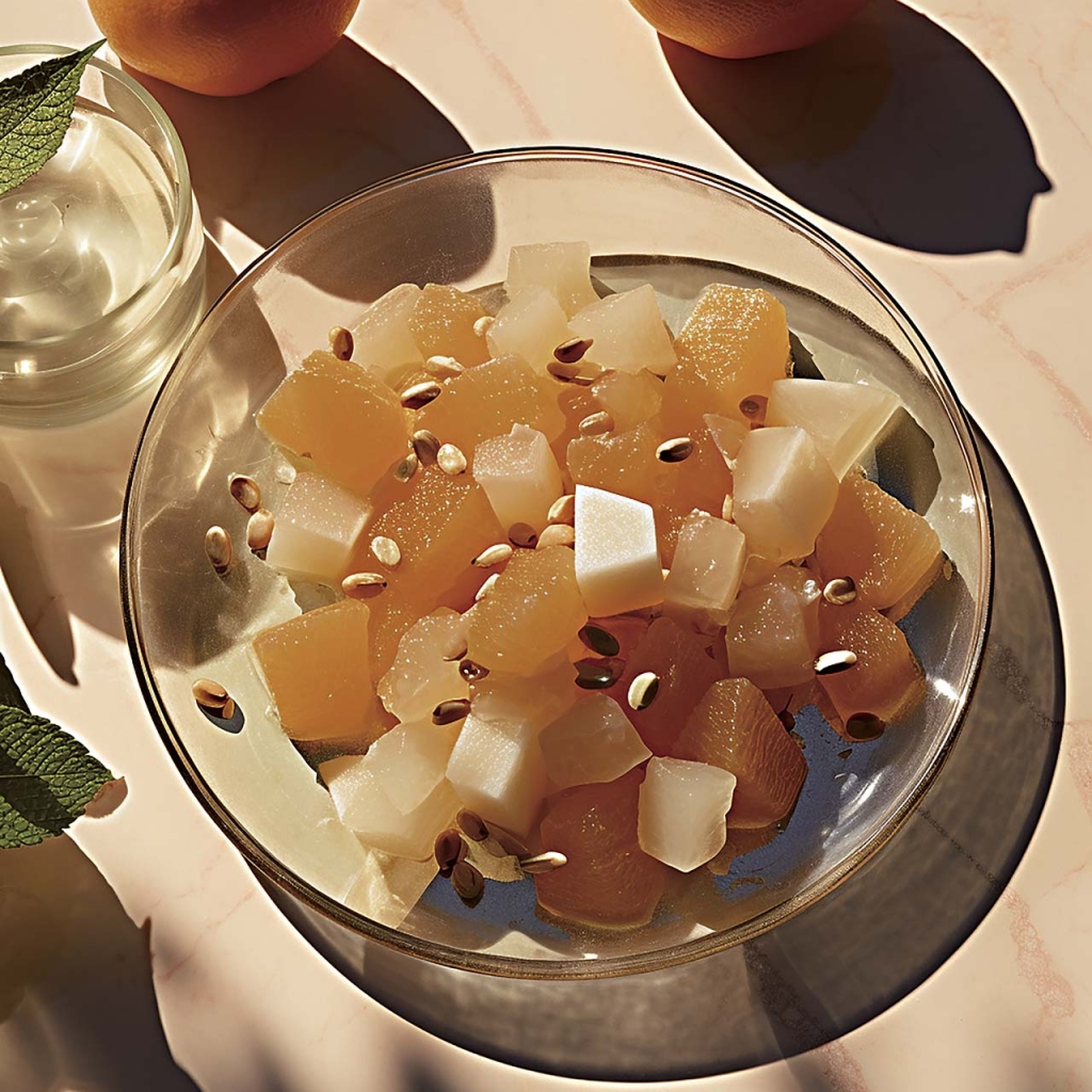 《乾淳歲時記》記錄了一道南宋茶食點「春蘭秋菊」,菜名用兩個不同季節的花來命名,實際上的食材卻沒有以花入菜,而是用剝粒的石榴、切丁的雪梨與去白膜的橙子佐以梅鹵、糖和紫蘇籽調成的醬汁,酸甜的基調以及梅子的香氣,搭配紫蘇籽如同芝麻的咬感,是一道色、香、味俱全的涼拌菜。