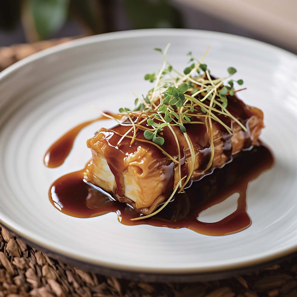 相較於「素蒸鴨」的詼諧趣味,《隨園食單》中所記的「素燒鵝」則有著仿葷菜的外型,更是一道上得了檯面的宴客菜。《隨園食單》中記「煮爛山藥,切寸為段,腐皮包,入油煎之,加秋油、酒、糖、瓜、姜,以色紅為度」,先將山藥煮熟,用腐皮包裹後煎炸定型,再以醬油、酒、糖等調成醬汁,入鍋煨煮紅燒,成菜色紅,如燒鵝,故得其名。「素燒鵝」醬香四溢,酥脆腐皮與綿軟山藥有著衝突的口感對比,至今仍是素齋中的一道名菜。