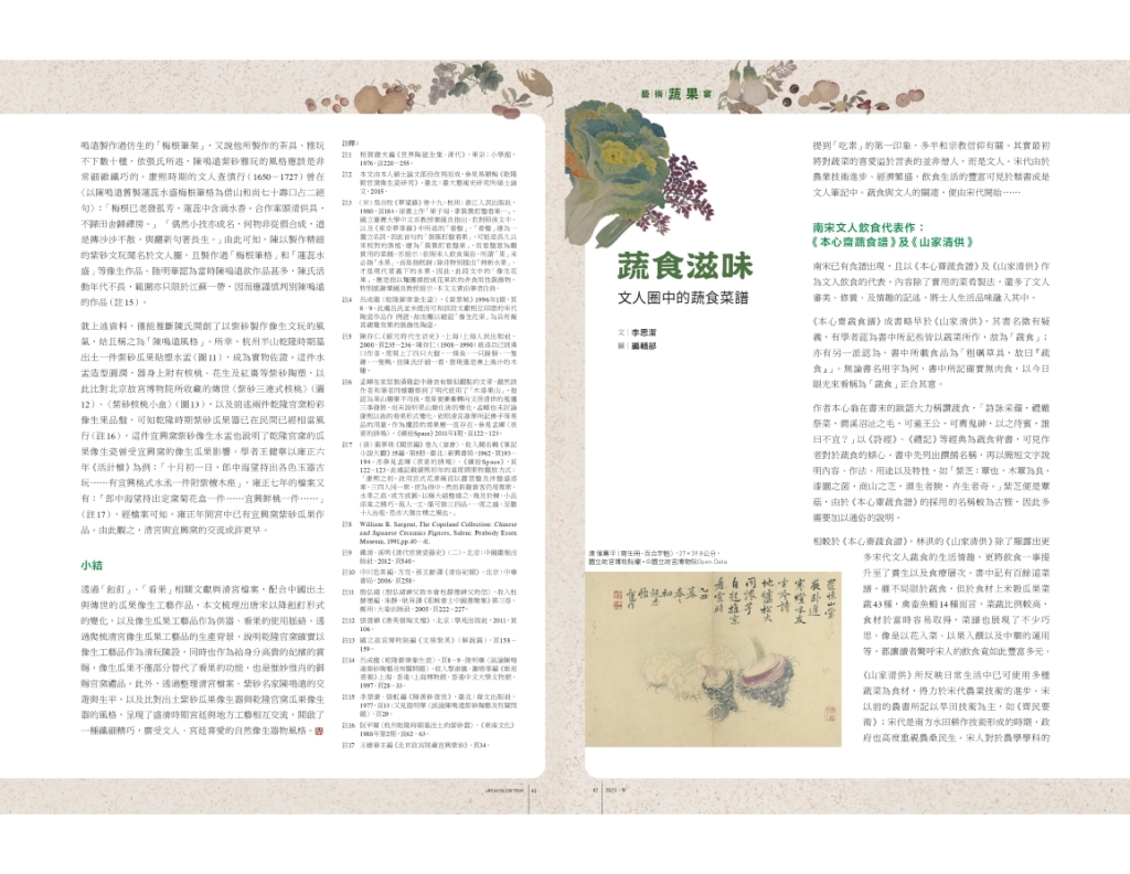 明清文人崇尚蔬食,並且以簡約清淡的料理,一方面作為探索飲食的靈感來源,一方面也呈現了文人將生活美感凝聚萃煉的結晶。袁枚《隨園食單.雜素菜單》於卷首言明「菜有葷素,猶衣有表裡也。富貴之人,嗜素甚於嗜葷」,雖未將蔬食置於葷食之前,但以「富貴之人嗜素」,點出袁枚心中「蔬食優於葷食」的排序。
