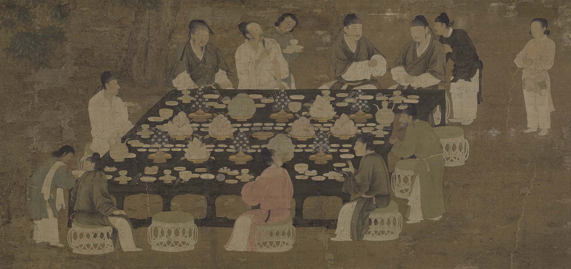 徐珂(1869-1928)於《清稗類鈔》提及「看席」源流:「餖飣,一作飣餖。今俗燕會,黏果列席前,曰看席飣坐,古稱釘坐,謂釘而不食。唐韓愈詩:『或如臨食案,肴核紛飣餖。』是也。俗且謂宴享大賓,一喫席、一看席也。」「餖飣」源自唐宋的飲宴陳設(註6),唐代「餖飣」指的是「將食物堆疊起來擺放」,《新唐書》中形容崔遠如同「飣座梨」般秀逸高潔,「飣座梨」即席間陳設之梨。宋代「餖飣」是為「看食」、「看盤」,是祭祀、飲宴時堆疊起來,供陳列而不食用的食物。北宋孟元老《東京夢華錄.宰執親王宗室百官入內上壽》(成書於1147年)中記述了百官向帝王賀壽的筵席:「每分列環餅、油餅、棗塔為看盤,次列果子。惟大遼加之豬羊雞鵝兔連骨熟肉為看盤,比以小繩束之。」席中以環餅等疊成「看盤」,惟遼使因飲食習慣不同,以各式熟肉為看食。《武林舊事》記述了南宋紹興二十一年(1151)十月高宗行幸清河郡王張俊宅邸,御筵上以八種水果堆疊出高飣:「清河郡王臣張俊進奉繡花高飣一行八果壘:香圓、真柑、石榴、棖子、鵝梨、乳梨、榠楂、花木瓜……」宋代的盤飣是何種樣貌呢?宋徽宗的〈文會圖〉(圖4)或可提供我們一些線索:由九名文士所圍繞的黑色大型方桌中央,陳列了八座高高疊起的果壘,依稀可識別出盤中的果物是桃子、香櫞與橙子等等,恰與高宗行幸張俊府席中的繡花高飣數量一致。
