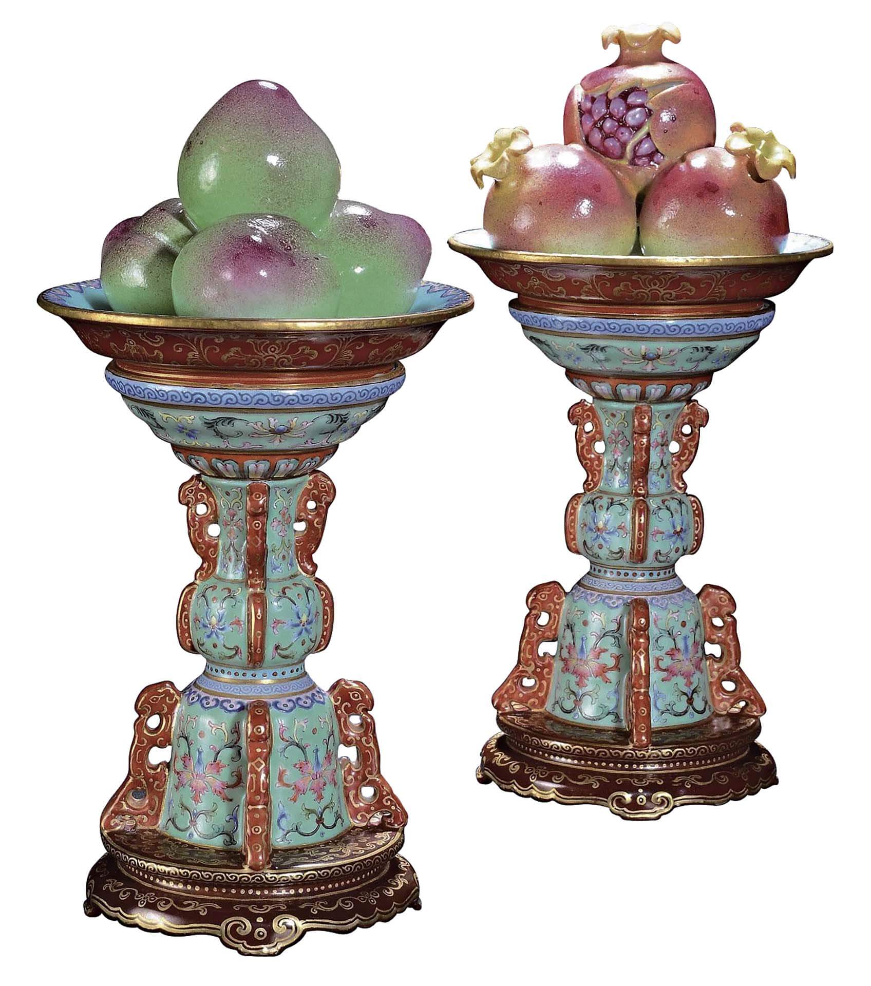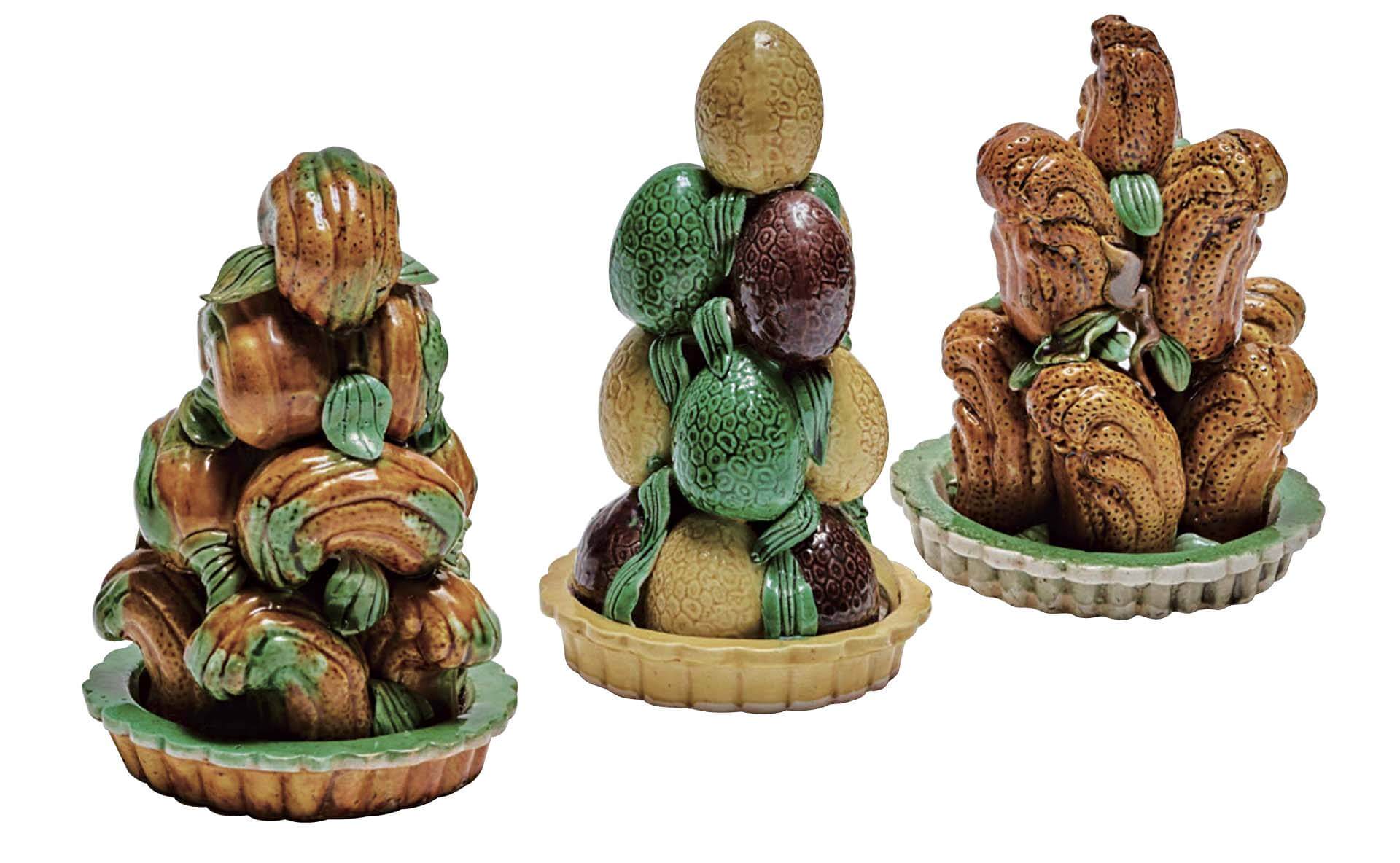 回溯中國工藝中的瓜果作品,唐代陝西臨潼慶山寺地宮出土供佛用的三彩南瓜(圖5),北宋靜志寺、淨眾院塔基,則出土供佛的玻璃葡萄(圖6);明清之際,有作供器使用的陶瓷果山(圖7),這類以模製核桃瓜果疊成塔狀的陶瓷器,歐洲人稱作「Fruit Pyramids」,視其為具有東方趣味的珍奇物,置於好奇箱中(註8)。乾隆三十五年六月十八日,時任九江關監督的伊齡阿曾進「琺瑯果供三份」(註9)恰可與拍賣市場所見的供器(圖8)相對應。