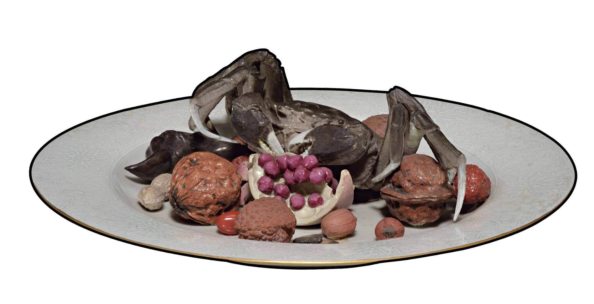 論及中國工藝中的「像生」一詞,南宋吳自牧(生卒年不詳,約活動於度宗年間,1240-1274)曾於《夢粱錄.四司六局筵會假賃》提及「像生花果」:「果子局,掌裝簇飣看盤果、時新水果……像生花果、勸酒品件;蜜煎局,掌簇飣看盤果套山子、蜜煎像生窠兒;萊蔬局,掌筵上簇飣、看盤菜蔬;供筵,泛供異品菜蔬、時新品味、糟藏像生件段等……」(註3)曾有學者認為前文中的「像生花果」,揭示了宋代即有「像生瓷」(註4)。依宋代的飲宴風俗,「像生花果」應指以麵粉揉捏塑形的花果形裝飾,而前文的「蜜煎像生窠兒」,可與周密(1232-1298)《武林舊事.高宗幸張府節次略》中的筵席對照:「雕花蜜煎一行:雕花梅球兒、紅消花兒、雕花筍、蜜冬瓜魚、雕花紅團花、木瓜大段兒、雕花金橘、青梅荷葉兒、雕花姜、蜜筍花兒、雕花棖子、木瓜方花兒。」所謂「蜜煎像生窠兒」係指「以糖蜜和澱粉製成,外形如動植物形態的食品」。由此可知宋代是一個喜歡製作「仿生食物」的朝代。關於中國工藝中的像生瓜果,將於下文詳述。