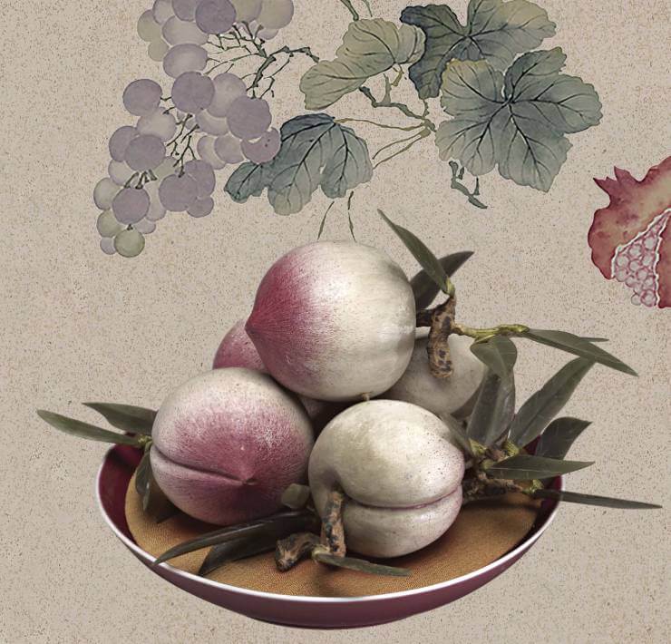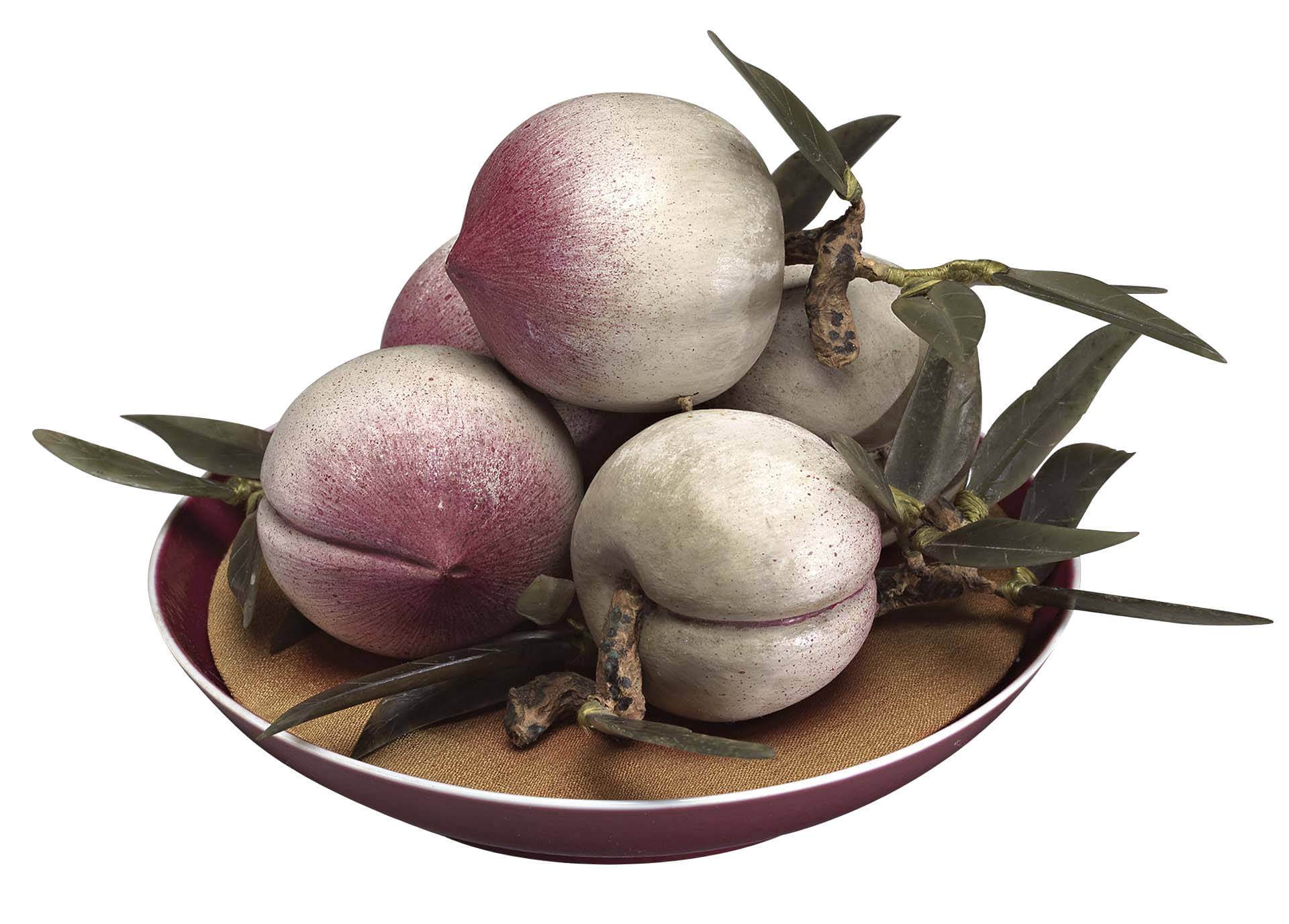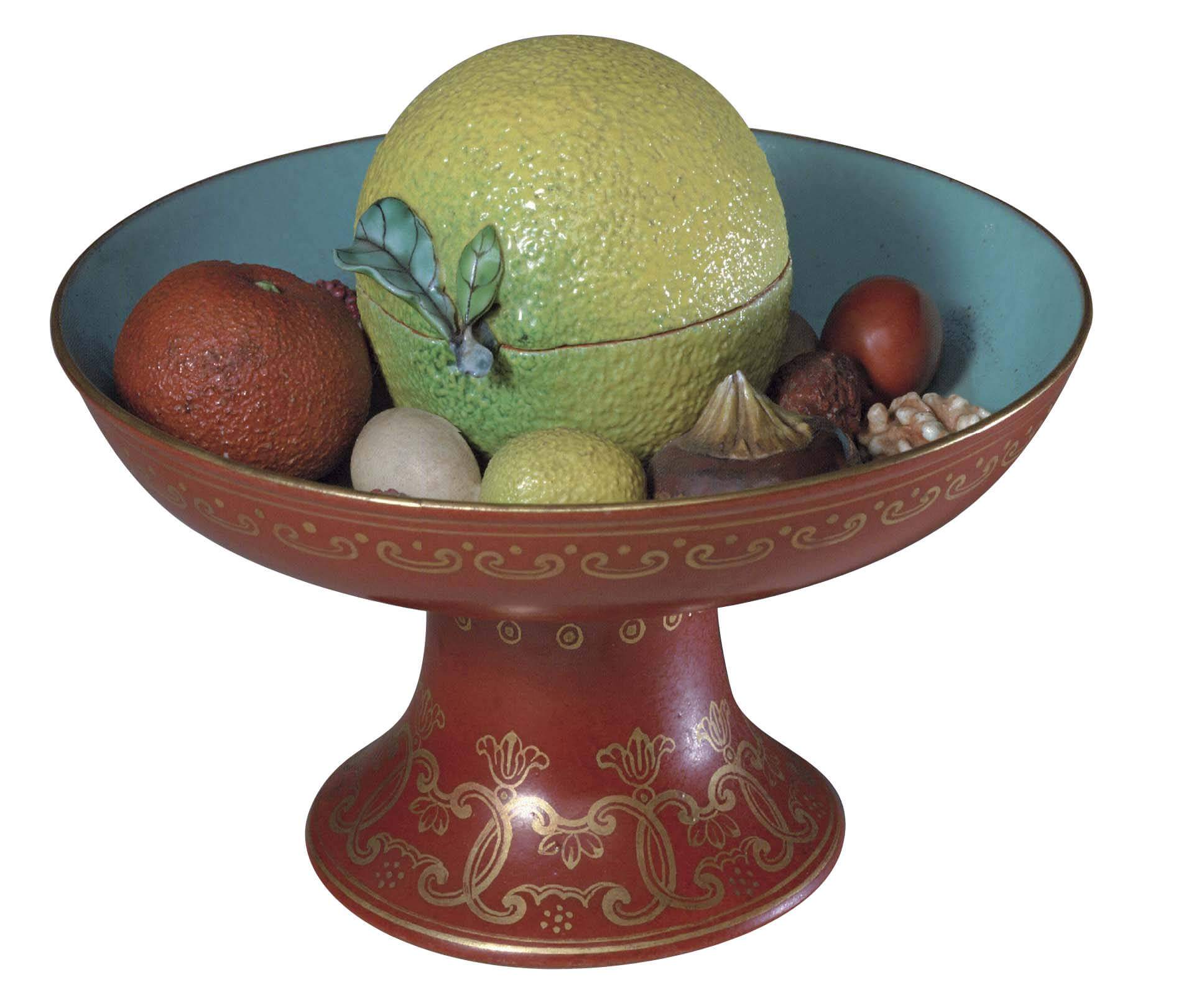 明晚期舉辦宴會時,經常將上了漆的彩繪木雕果子堆成小塔狀作為裝飾。崇禎(1573-1620)年間逐漸廢去「果山碟架」,改用大盤盛裝,並將各色果物疊高。到了清代康熙初期(1654-1722)初期,「水果之高,或方或圓,以極大磁盤盛之」(註7)由此可見,雖然明代晚期出現了取代真實果物的木雕漆果,但工藝品並未全面取代真實的看食。