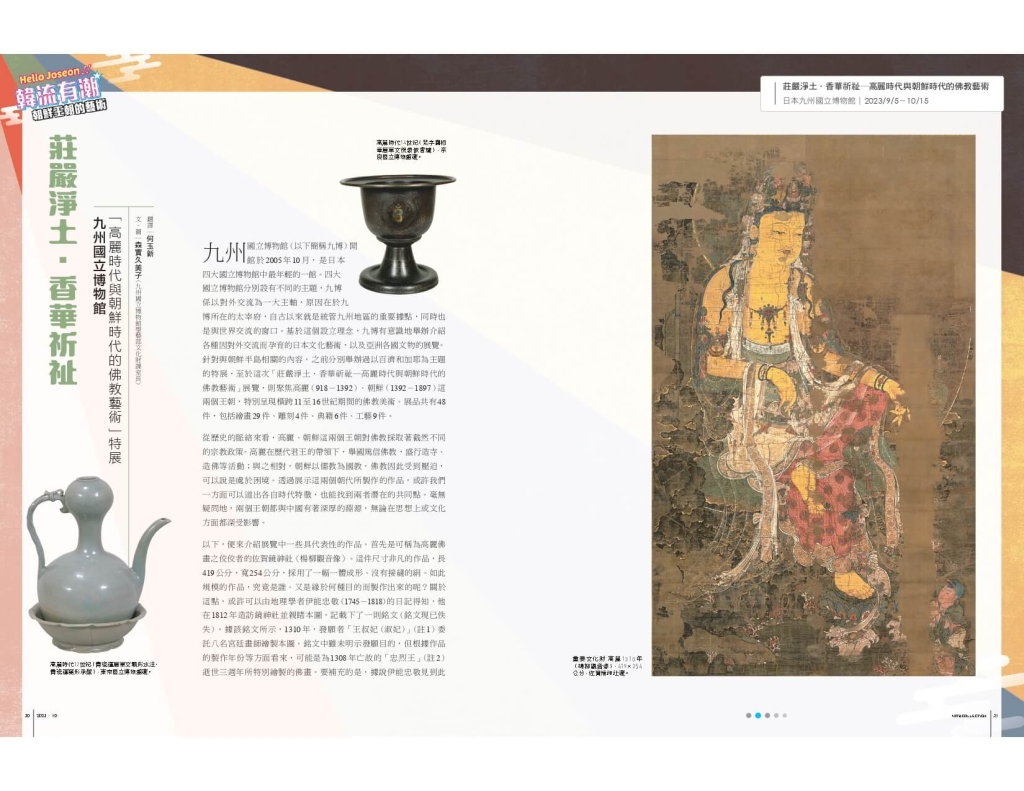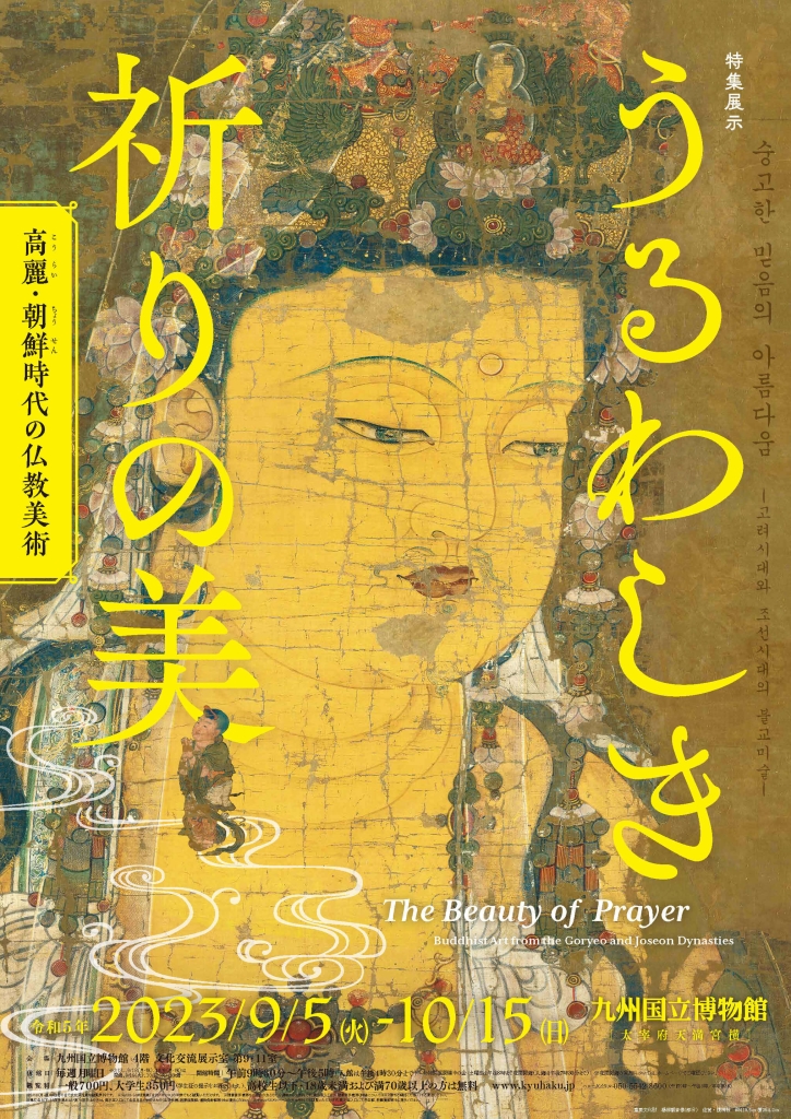 九州國立博物館(以下簡稱九博)開館於2005年10月,是日本四大國立博物館中最年輕的一館。四大國立博物館分別設有不同的主題,九博係以對外交流為一大主軸,原因在於九博所在的太宰府,自古以來就是統管九州地區的重要據點,同時也是與世界交流的窗口。基於這個設立理念,九博有意識地舉辦介紹各種因對外交流而孕育的日本文化藝術,以及亞洲各國文物的展覽。針對與朝鮮半島相關的內容,之前分別舉辦過以百濟和加耶為主題的特展,至於這次「莊嚴淨土.香華祈祉─高麗時代與朝鮮時代的佛教藝術」展覽,則聚焦高麗(918-1392)、朝鮮(1392-1897)這兩個王朝,特別呈現橫跨11至16世紀期間的佛教美術。展品共有48件,包括繪畫29件、雕刻4件、典籍6件、工藝9件。
