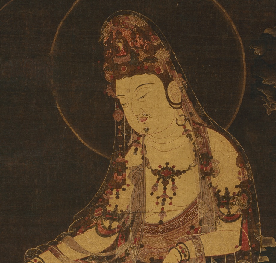 除了鏡神社的作品,這次還展出12幅觀音像。其中多數與鏡神社所藏品一樣,表現的是《華嚴經.入法界品》中善財童子於普陀洛山拜謁觀音的場景,稱為「楊柳觀音像」。若比較奈良談山神社和福岡承天寺的〈楊柳觀音像〉,兩者不僅在觀音的姿容或以泥金所繪的軀體等特徵上共通,就連衣著的紋樣或衣紋線條的起筆方式都是一致的,可謂充分體現了研究常提到的高麗佛畫圖像的沿襲性。