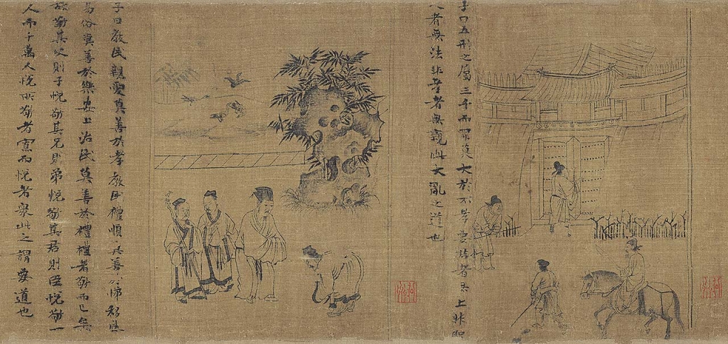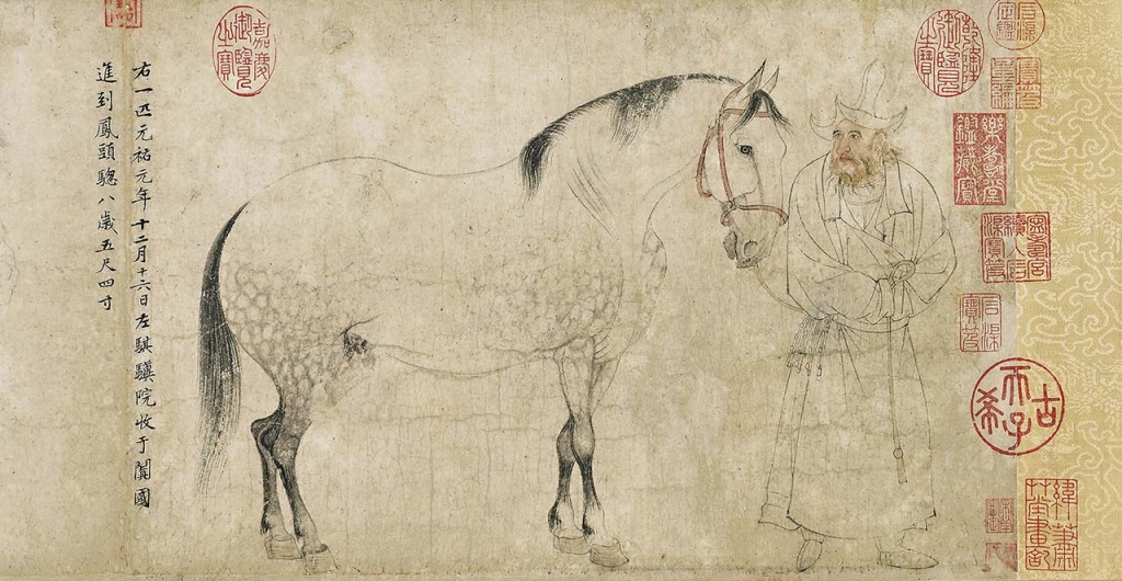 宋末元初的周密(1232-1298)《雲煙過眼錄》一書中,存有似可對應〈五馬圖卷〉與〈孝經圖卷〉的記載;若據該記載,則李公麟所作〈孝經圖〉與〈天馬圖(推測可能為〈五馬圖卷〉的原名)〉曾同時為元初大收藏家王芝典藏。其後,具備高度的「再現性」且展現線條之美的〈五馬圖卷〉,以及流露文人畫「拙古」取向的〈孝經圖卷〉,這樣兩極化的風格,可以說被宋徽宗(1082-1135,1100-1125在位)繼承了下來。