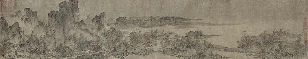 〈江山樓觀圖卷〉為活躍於北宋前期畫院的燕文貴所作,畫中結合了華北畫風的山水樣式與刻畫精微的人世情景,最能體現被譽為「燕家景緻」的燕文貴畫風。作中畫面由三段場景構成:作為開場的第一段描繪著遼闊無垠的遠景,承轉的第二段以遠山掩映綿延無盡的景深,第三段則由壁立千仞的峽谷作結全卷。隨著各段場景推移,畫中的人物神情動作也隨之變化;隨著手卷開展,一陣暴風雨過境的場景,也在作者巧筆之下躍然卷上。