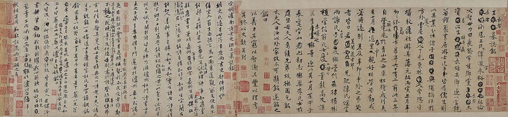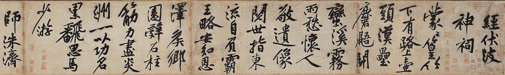 本次展覽除了〈五馬圖卷〉圖後所拖黃庭堅跋,更匯集了另外三件日本所藏黃庭堅書精品。其一為〈王史二氏墓誌銘稿卷〉(東京國立博物館藏),是將兩篇墓誌銘草稿合裱為一卷的作品。其中〈王長者墓誌銘〉為黃庭堅母系姻親王潨的墓誌銘草稿,王潨沒於元祐元年(1086),黃庭堅受其子王楙委託所作;而〈宋故瀘南詩老史翊正墓誌銘〉則是為元符二年(1099)正月下葬的史扶而作;由於書風相似,推測〈王史二氏墓誌銘稿卷〉的書寫時期應與〈五馬圖卷〉黃庭堅跋相近。其二為黃庭堅晚年的草書傑作〈李太白憶舊遊詩卷〉(京都藤井齊成會有鄰館),所書內容為唐代李白的〈憶舊遊寄譙郡元參軍詩〉。其三為 〈伏波神祠詩卷〉(東京永青文庫),這件巨幅行書傑作成於建中靖國元年(1101)五月,時年57歲的黃庭堅以豪邁的筆法書寫唐代劉禹錫的〈經伏波神祠詩〉一首及自跋一篇。本展連同〈五馬圖卷〉跋,會場共計陳列五件黃庭堅書作,供觀眾親臨比較。