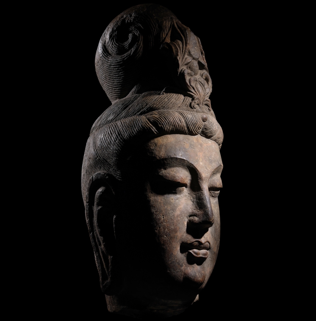 佛教藝術之唐〈灰石菩薩頭像〉,高48公分氣勢偉岸,佛首比例優雅均勻,雕刻細膩嚴謹,面相祥和俊美,彎眉大眼,目光下斂,嘴唇豐厚,嘴角略上翹呈微笑狀,為唐代佛教藝術高標準的見證。曾經英國德斯蒙德古爾Desmond Gure(1905-1970)、美國亞瑟・M・賽克勒Arthur M. Sackler(1913-1987)遞藏。