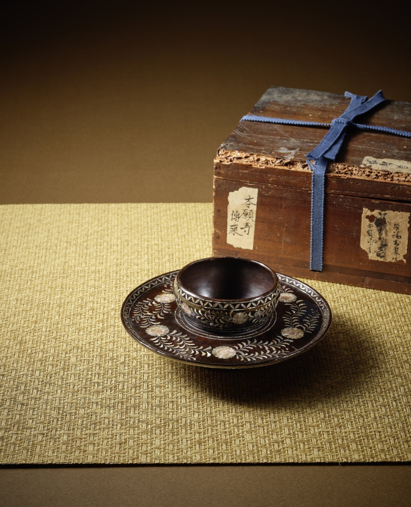 除了瓷器,漆器亦有可觀。元〈黑漆嵌螺鈿纏枝雛菊紋盞托〉,托斂口,弧壁;盤平出,口微上卷,圈足外撇。通體髹黑漆,托外壁和盤内外以螺鈿嵌雛菊紋飾,圈足處亦見小花紋飾,工藝精巧,别具匠心。黑漆地嵌螺鈿於元代頗為流行,唯留存不多,主要是盤、盒、箱等小型器具,作盞托者更罕。