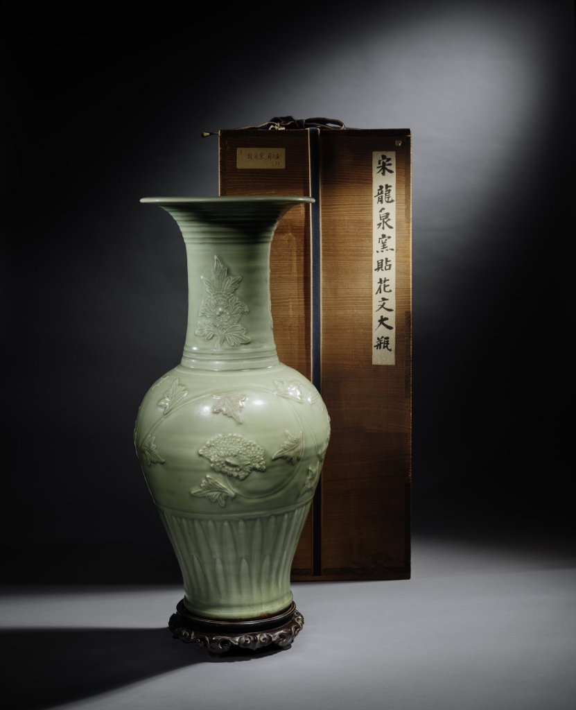 該展以南宋/元〈龍泉窯青釉纏枝牡丹紋鳳尾尊〉領銜,此瓶形體高大而不變形,體現龍泉窯燒製大件器物之高超技藝。裝飾於尊頸上部之凸弦紋,與足脛之兩層菊瓣紋遙相呼應,頸部與腹部之主題紋飾則分別為折枝及纏枝牡丹紋,清晰細緻,是為龍泉窯宋元時期之精美器形,早期曾為東京繭山龍泉堂藏品。繭山龍泉堂至今已有百餘年歷史,專攻中國古美術,早期以龍泉瓷器起家,後期涉獵書畫、青銅器等多個門類。該堂為紀念創立70週年,特別編著收藏於圖錄《龍泉集芳》,所錄之器,盡是無上極品,此尊為其中之一,精絕可想而知。