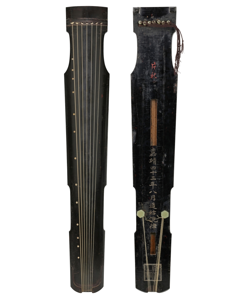此外,文人書房的必備音樂重器-古琴,本場亦兼備。古琴為正聲與雅樂的代表,南宋〈仲尼式「片秋」琴〉,琴音堅實,有金石聲,黑髹上下遍發小蛇腹斷,肩起二徽半,腰收八徽,紫檀岳山、冠角及龍齦,青玉軫足,蚌徽,桐木面板,內有天地柱,龍池上方 填朱漆「片秋」二字,龍池鳳藻間陰刻「嘉靖四十三年八月造姑洗律」,鳳藻下方陰刻「鄭府之寶」印。即便未能撫琴一曲,僅欣賞琴身亦為文雅樂事。