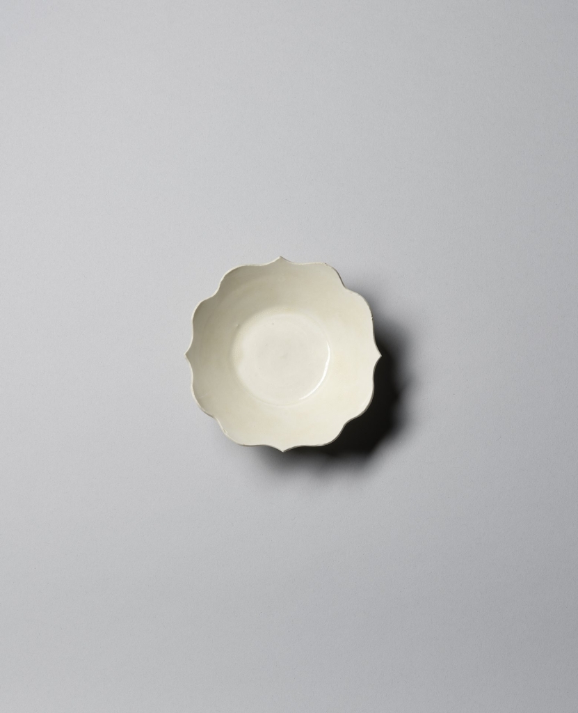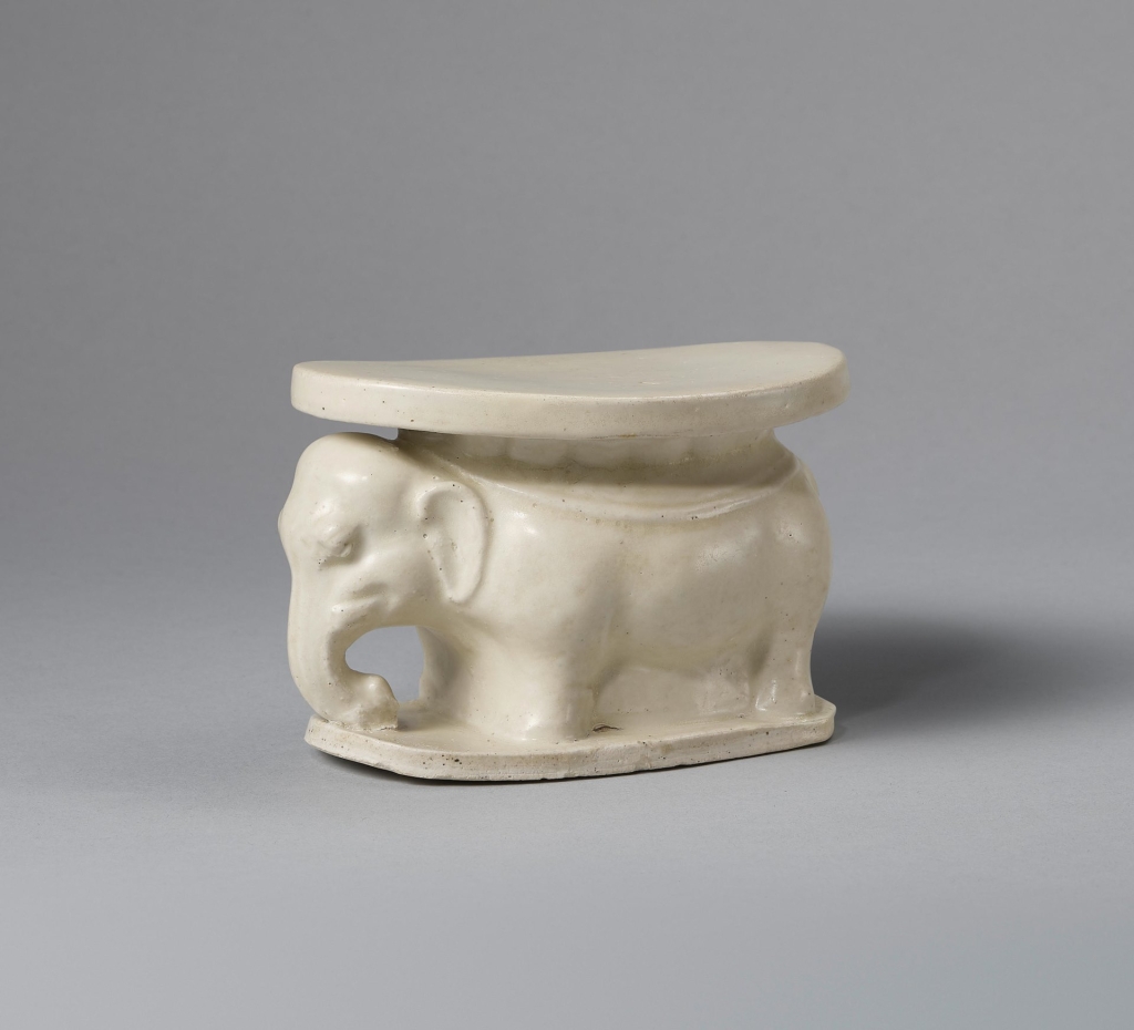 五代/宋〈定窯白釉花口盤〉來源顯赫有緒,曾經著名藏家沐文堂關善明及北美十面靈璧山居之手。白釉花口盤,流行於晚唐五代,此品釉色純淨無瑕,四瓣蓮花瓣口起伏較大,具盛開之勢,可見成型技藝之高超,是為珍品。此拍品造型生動,枕面及底座呈橢圓形,頂面略凹,中間塑四足立象,俯首而站,沉穩敦實。枕式較高,通體白釉光潤潔淨,胎質縝密,工藝極高。保存完整,兼具觀賞性和實用性。