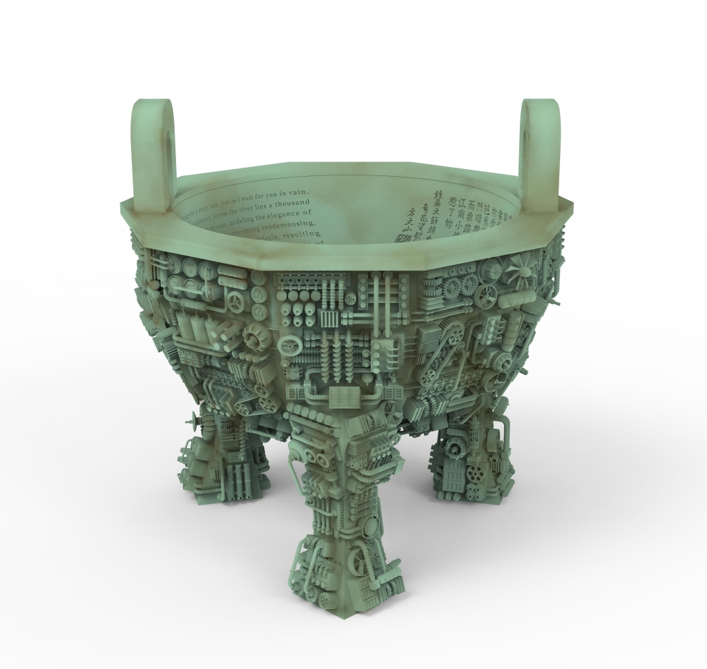 「宋韻・凝簡」另展有一件當代藝術—方文山〈現代機械毛公鼎〉。宋詞乃宋代文學巔峰,集詞人墨客之精華,其文字之美流芳百世,眾人皆知。當代詞人方文山,筆下名詞《青花瓷》開首一句「天青色等煙雨」,字簡意濃,提及的「天青色」,便是宋代汝窯釉色,可見千多年後,宋代美學對世人對美的想像仍啟迪甚深。此裝置藝術作品,由方文山親自創作,內部鐫刻歌曲〈青花瓷〉局部詞句作銘文,毛公鼎器形取自青銅器,卻賦予汝窯釉色,再以西方蒸汽龐克風格的機械感呈現,從藝術領域相互融合,體現複合式藝術視野與文化觀點。