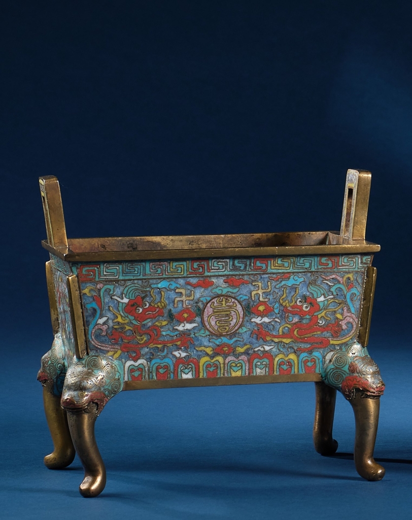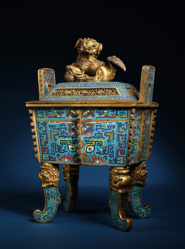 「中國瓷器及工藝精品」專場208件,以「鴻禧美術館舊藏珍稀漆器及掐絲琺瑯」專輯珍品8件備受矚目,皆有著名出版及展覽記錄可依,當中景泰藍焦點要數清乾隆〈掐絲琺瑯獸面紋四足方蓋爐〉及明萬曆〈掐絲琺瑯雙龍戲珠紋四足方爐〉。乾隆蓋爐造型磅礴,鎏金緊實,掐絲細膩,為宮殿重器,反映出乾隆時期掐絲琺瑯和鎏金工藝獨特之美;萬曆方爐採用了多種琺瑯釉,有紅、白、黃、寶藍色、天藍色和粉紅色,甚為珍罕,爐身飾有各種吉祥紋樣,更見工匠之心思,主紋飾為雙龍捧壽,壽字兩側有「卍」,輔助圖案為二方連續紋和蓮瓣紋,帶掐絲填紅色琺瑯「大明萬曆年造」款。無獨有偶,北京故宮另有一件器形、紋樣、及尺寸俱同之品。