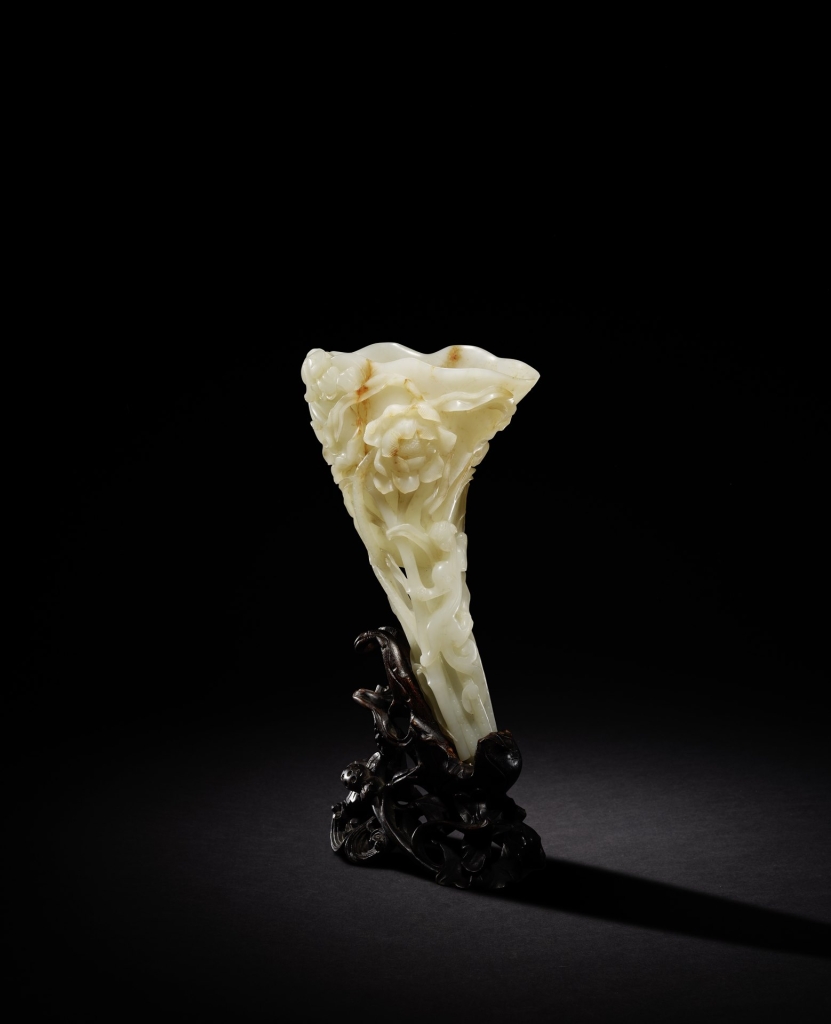 清代玉器方面亦相當精彩,焦點包括一只清中期〈白玉雕蓮葉螭龍犀角式杯〉,其玉質溫潤滋肥,仿犀角杯樣式,以稻穗、蓮葉以及螭龍三者為主題紋飾,工藝繁複,非常考驗工匠功力。此拍賣設有中華茶文化主題單元,透過茶道器物逾40件,帶出深厚的精神文明,旨在讓藏家感受悠久的茶道文化,亦為新藏家提供一個輕鬆的收藏入口,融古董收藏於生活,重點包括上海龔心釗(1870–1949年)舊藏〈沈存周款錫質淺刻詩詞茶罐一對〉,及唐代至清代之茶室生活用具,涵蓋瓷器、漆器及竹雕等。