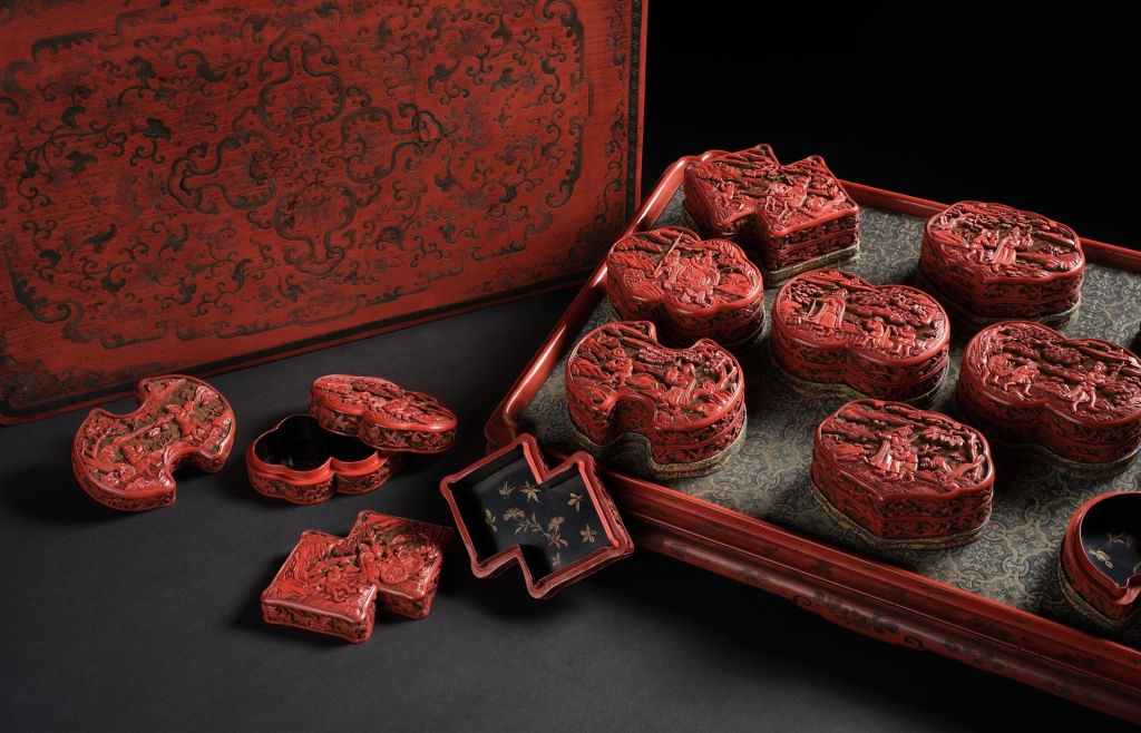 同屬鴻禧美術館舊藏的漆藝拍品,首推一套罕見的清乾隆〈御製剔彩職貢套盒〉。漆盒共計十件,品相完好如新,以方勝式、如意頭式、雙圓式、雲頭式、銀錠式為造型,兩兩成對,蓋面皆採用剔彩技法,裝飾職貢圖。職貢圖描繪邦交國、蕃屬國或周邊部族向皇帝覲見納貢、國力強盛之貌。此品保留於乾隆年間配造之包裝匣,最為難得。
