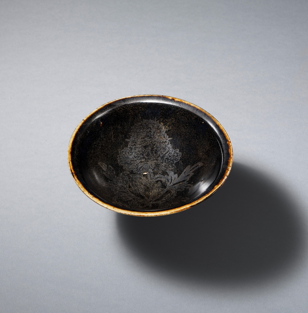 北宋 〈定窯黑釉描金牡丹紋碗〉,黑釉撇口碗形似斗笠,通體施黑釉,碗內以金彩繪折枝牡丹紋。定窯乃宋代使用金彩較多者,此碗內繪折枝牡丹一朵,牡丹含苞待放,與定窯牡丹紋風格一致。宋代時期,不論北方南方,帶有金彩之完整器物少之又少,此為難得佳作。
