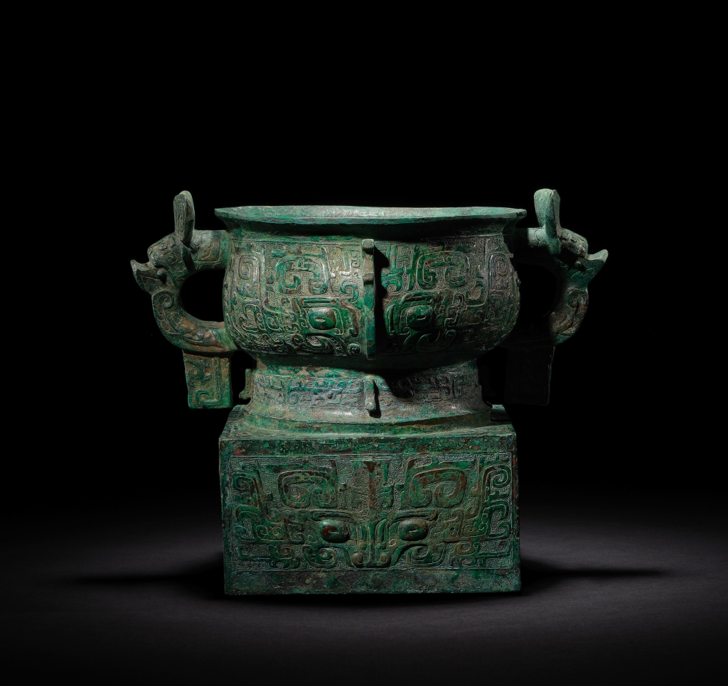 青銅重器以西周〈青銅饕餮紋方座簋〉為焦點,此簋敞口,口沿外侈,鼓腹略垂,束頸與腹部兩側鑄半環形獸耳,下垂長方形垂珥,作獸首銜鳥狀。簋身前後兩側出戟,腹部對稱飾以饕餮紋,突出「曰」字形雙眼,眉眼口舌皆以浮雕表現,獸面之餘以雷紋為地。圈足四面出戟,飾鳥紋,圈足外撇,下與方座連鑄。方座頂部四角飾小型饕餮紋,座身四面亦飾有饕餮紋,以雷紋襯底。此簋器表通身綠銹斑駁,少數不被銹跡覆蓋處呈紅銅色,光亮可鑒,整體造型莊重沉穩。簋腹內底鑄有銘文兩行共七字:「伯恆父作寶尊彝」。「作寶尊彝」,意為鑄造這件寶貴的祭祀用器。帶「恆父」的青銅器目前在錄的有兩件,皆出土於山西省洪洞縣永凝堡。