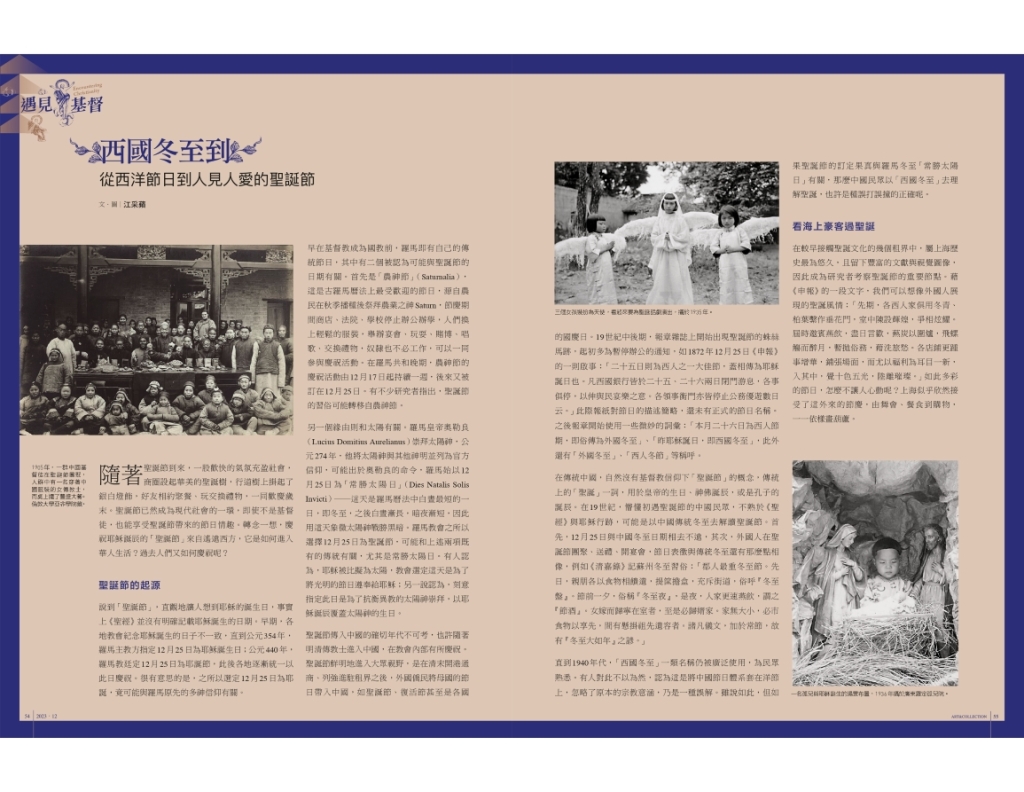 隨著聖誕節到來,一股歡快的氣氛充盈社會,商圈設起華美的聖誕樹,行道樹上掛起了銀白燈飾,好友相約聚餐、玩交換禮物,一同歡慶歲末。聖誕節已然成為現代社會的一環,即使不是基督徒,也能享受聖誕節帶來的節日情趣。轉念一想,慶祝耶穌誕辰的「聖誕節」來自遙遠西方,它是如何進入華人生活?過去人們又如何慶祝呢?