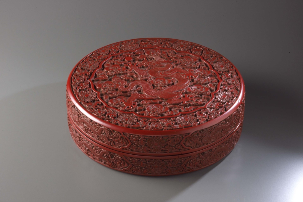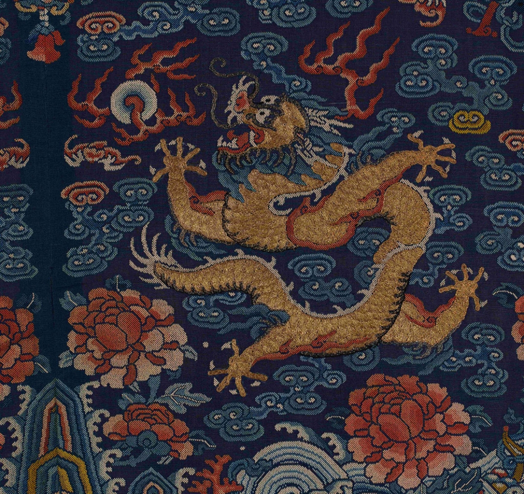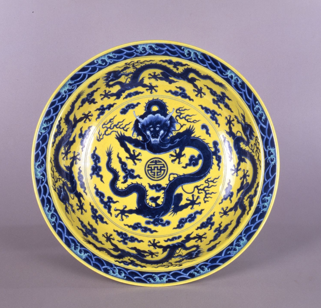 為慶祝龍年到來,靜嘉堂推出「龍」明星陣容,本次亮相的作品,有明嘉靖〈青花龍紋大壺〉、明〈雲龍堆朱盒〉、清乾隆〈青花黃彩雲龍紋盤〉等,初次亮相的明〈五彩龍花卉紋尊式花瓶〉高達77公分,體量驚人;清〈紺地龍「壽山福海」圖刺繡帳〉原為龍袍,被剪裁改為煎茶席使用的帳布,形制相當特別。