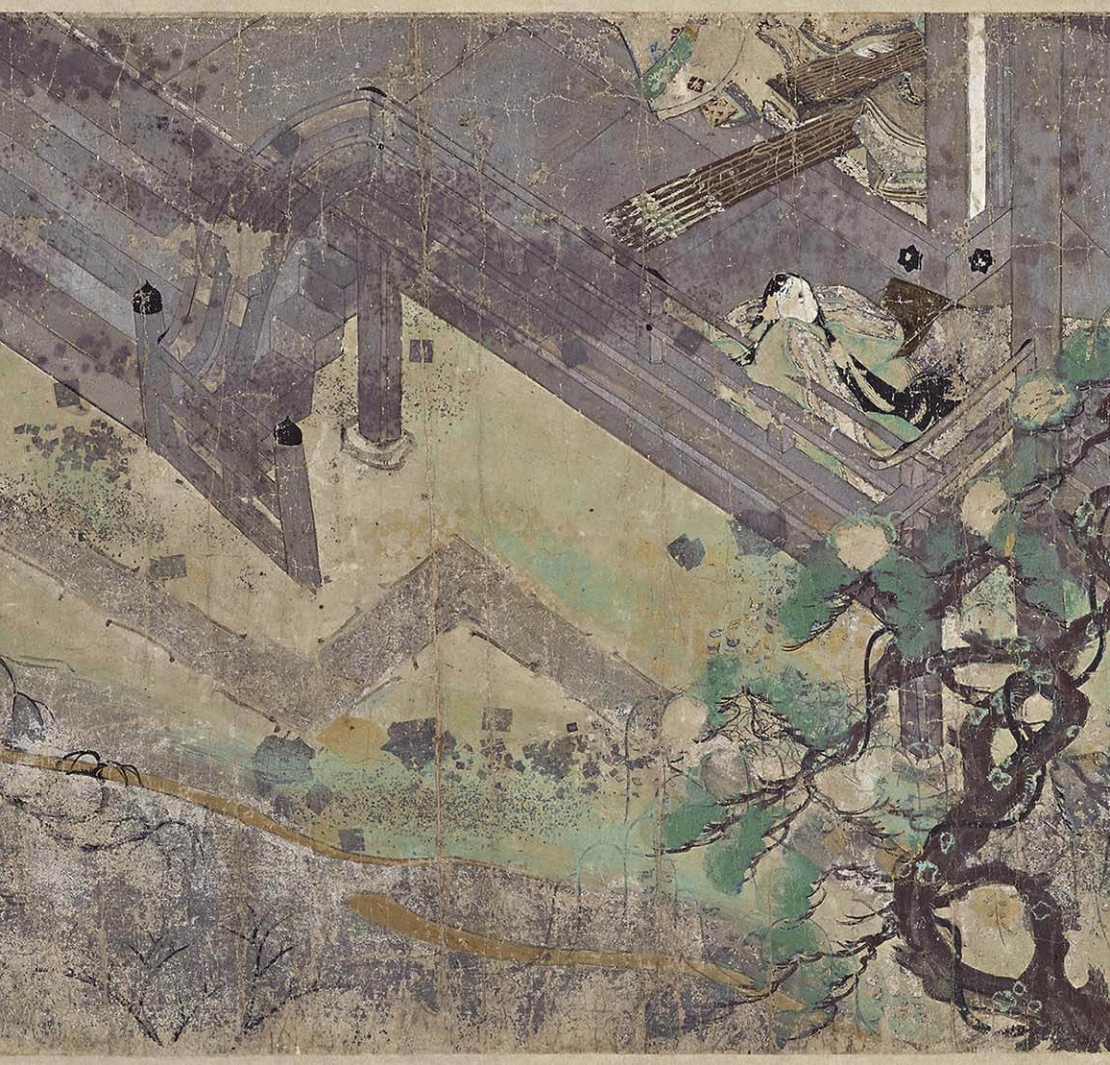 〈寢覺物語繪卷〉(圖1)是將「夜半寢覺」物語轉為繪畫的現存唯一作品,這個物語講述了人稱「寢覺之君」的女子所經歷的坎坷命運。這幅繪卷中,採用了習見於平安繪卷的代表性手法,像是用細線畫出眼鼻、以細膩地傳達出情感的「引目鉤鼻」法,或是將建築物的屋頂省略以描繪出室內情景的「吹拔屋台」等等。此外,畫中還使用了一種被稱為「作繪」(つくり繪)的技法,也就是在濃密的色彩上,以粗細一致的墨線勾勒出輪廓。關於其具體的製作年代,有一說認為畫中彎曲的樹木和金銀裝飾手法,與12世紀中葉〈平家納經〉(嚴島神社藏)的作風相似,另一說則指出斜向分割畫面的幾何式構圖,給人一種清新的印象,接近於12世紀後半的作例。無論如何,此畫集合了傳統大和繪的典型特徵,包括塗布的鮮明色彩、金銀裝飾,以及予人柔和印象的植物形態等等,是足以被稱為「大和繪原點」的作品之一。