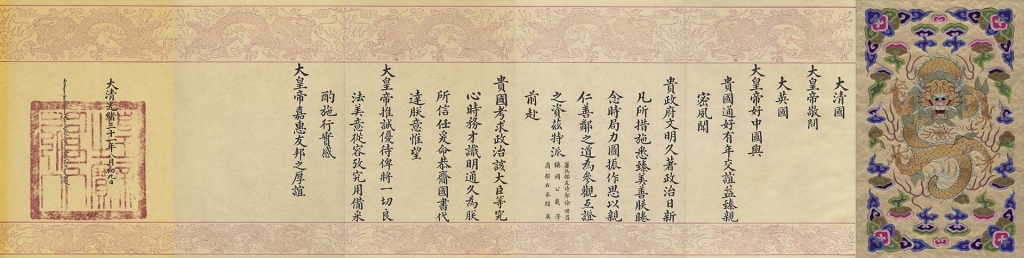 「皇帝之寶」(圖3),栴檀香木質。盤龍紐方形璽,漢文篆書滿文篆書。面15.5公分見方,紐高11公分,通高16.6公分。《交泰殿寶譜》記此寶為「以肅法駕」之物。這是二十五寶中唯一的木質寶璽,也是二十五寶中使用範圍最廣、最頻繁的寶璽之一。皇帝登基、皇后冊命、皇帝大婚、發布殿試金榜等詔書上常鈐蓋「皇帝之寶」。乾隆帝去圓明園或避暑山莊時,亦要攜帶此寶。與玉質相比,檀香質地更易便攜且耐磕碰,使用起來更為方便。乾隆帝曾曰:「君人者,在德不在寶,寶雖重,一器耳。明等威、徵信守,與車旗章服何異。德之不足,則山河之險,土宇之富,拱手而授之他人,未有能持此區區尺璧足以自固者……故寶器非寶,寶於有德。」以乾隆帝重德行的言論來看,他對寶璽的材質並無執念。鈐蓋「皇帝之寶」的文書,如光緒二十年殿試的〈清代大金榜〉和〈大清國致荷蘭國國書〉,兩件均藏於中國第一歷史檔案館。另外,臺北故宮藏〈大清國致大英國國書〉亦鈐有此璽(圖4)。