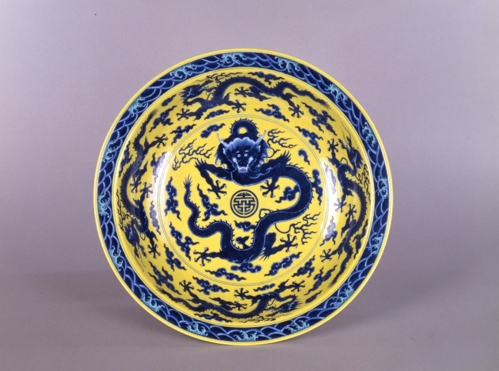 這個大盤使用了濃麗的青花,以雲龍為主圖,邊緣飾以波濤紋,填塗背景的則是清代開發、含有酸化銻的黃彩。龍的鬍鬚、背鰭、火焰,以及細緻的圓圈是在釉下先繪製的,之後才在釉上施上黃彩。這條龍正面向人,有著象徵皇帝的五爪,捧「壽」字龍珠。盤緣繪有山和波浪圖案,令人聯想到「壽山福海」。波浪上塗有淺淺的綠色釉料,在厚重的色彩增添了一絲亮麗,可說是乾隆官窯的精品。