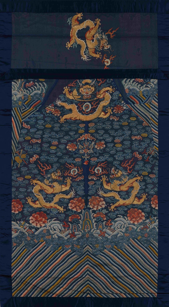 所謂「帳」(とばり)是日本的茶室(可由一般和室布置而成)中,掛在茶室的進出口的長幕。中國製造的華麗長幕,就像是一種舞臺布置,引領日本人進入他們嚮往的中國文人的世界。這件帳在深藍色的羅紋絲綢上,以各種色線、金銀線繡出了象徵皇帝的五爪龍及吉祥圖案。從圖案結構和布料的接合來看,這個帳很有可能是改裝自中國皇帝龍袍,是件引人入勝的作品。