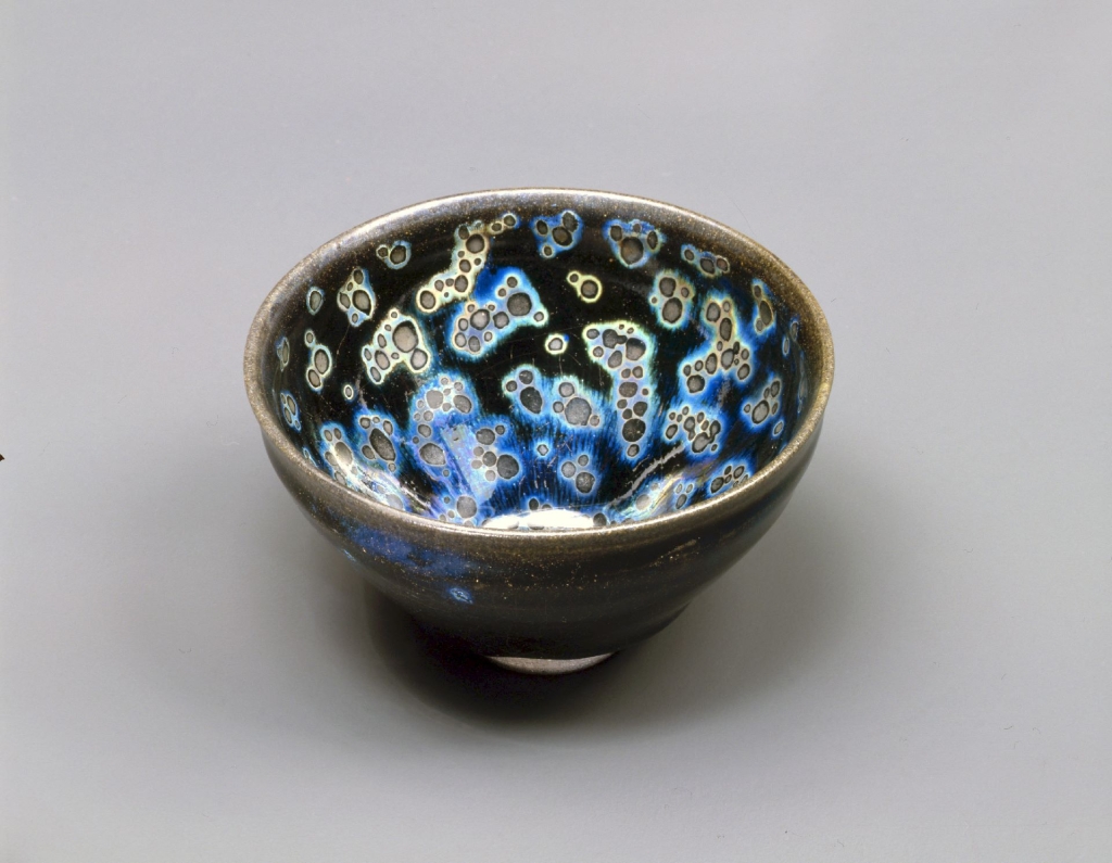 日文「天目」指的是配合北宋時期點茶法的黑釉茶碗,而「曜變」原本是指「窯變」,「曜」字又更有光輝、星芒的意思。這個茶碗內分布著大小不一的斑紋,散發藍色的光彩。讀者也許知道,2009年杭州南宋宮殿相關遺址中曾發現曜變天目殘器,一起出土的還有其他珍貴的陶瓷碎片和漆器,這項考古表示,曜變天目不僅是因受到日本喜愛而輸出,在南宋宮廷中應該也頗受重視。