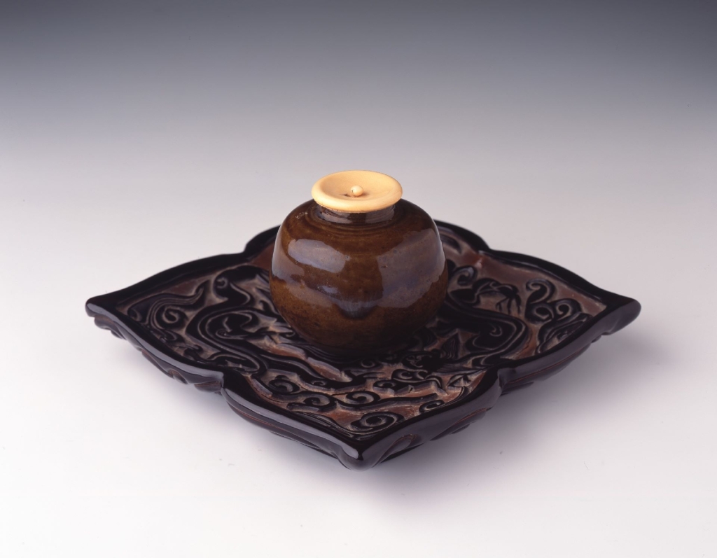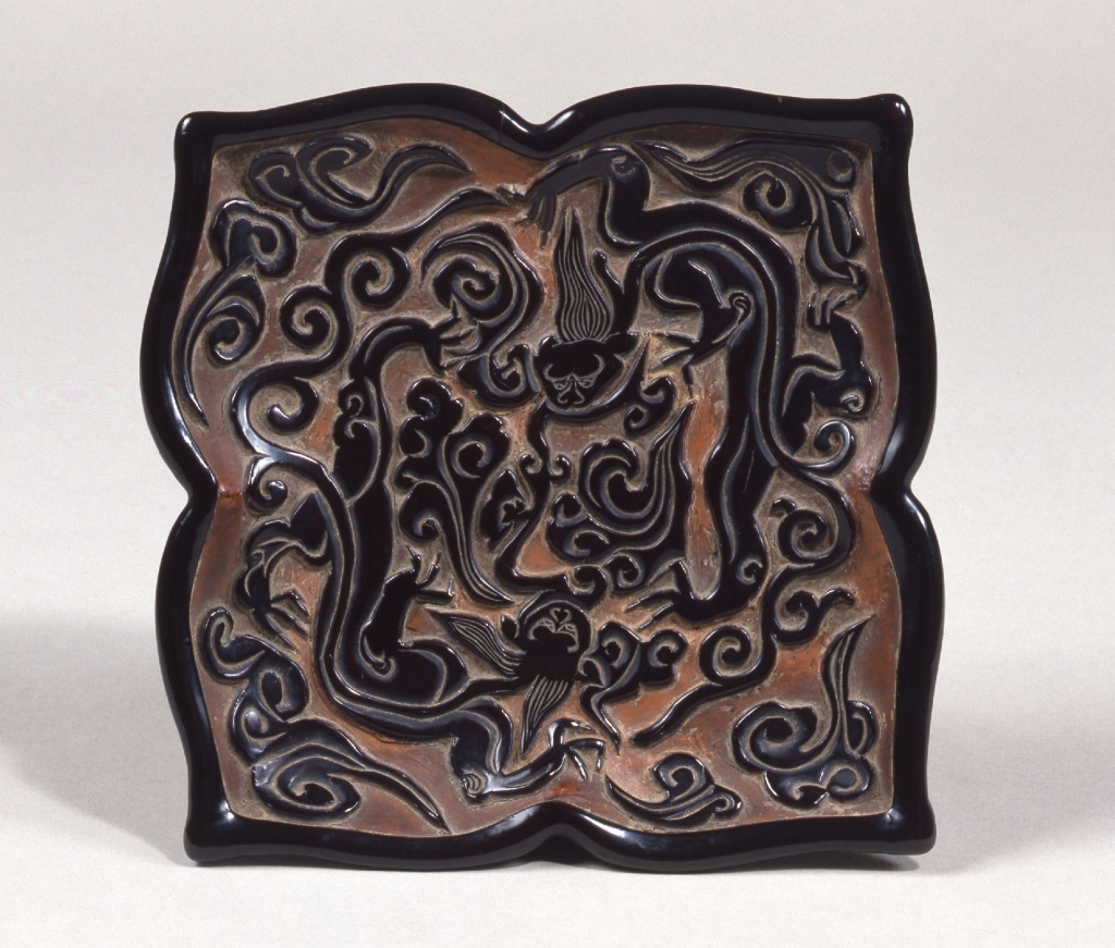 至於「利休物相」和龍之間的關聯呢?這個茶入附帶的托盤上有剔黑的「螭龍紋」,底部則是朱漆。螭龍是龍的變種,形狀類似蜥蜴,沒有角和鱗片,尾巴細長。當時,伊達家委託茶人小堀遠州(1579-1591)尋找能夠配上這個高級茶入的托盤,最後選中了這件托盤,將這個宋代方形托盤轉45度,如菱形一般,再放上「利休物相」,顯得格外優雅。