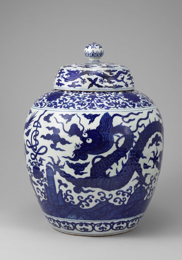 這件大壺被雙龍圍繞,蓋子上裝飾寶珠狀的圓紐。若將蓋子打開,可以在口緣處看到「大明嘉靖年製」的款識。根據文獻記載,嘉靖年間(1522-1566)景德鎮官窯使用了從西方進口的鈷藍釉料「回青」,其豔麗而深邃的藍色在白瓷上顯得格外鮮明。兩條龍飛翔於壺的前後,五爪張開,飛騰於山川大海上。在龍前方,有個靈芝生長成的「壽」字,整體形成了「壽山福海」的設計,寓意著長壽和幸福。
