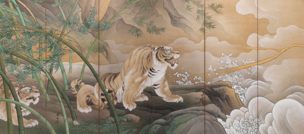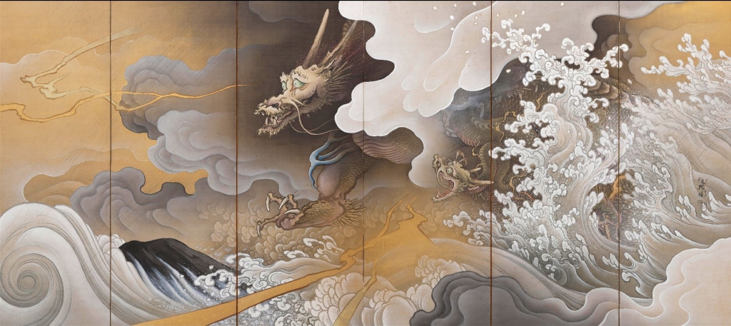 這件屏風是「近代日本畫之父」橋本雅邦(1835-1908)的代表作,右側描繪蒼龍親子伴隨雷鳴飛來,左側的兩頭虎在懸崖上向龍咆哮。《易經》中有語:「雲從龍,風從虎」,所以龍與雲、虎和風,皆是「龍虎圖」中典型的要素。橋本雅邦利用豐富的色彩和巧妙的空間表現,將古典畫題「龍虎圖」昇華為近代日本畫,可惜當時大家對這件作品褒貶不一,未能在展覽會上獲得獎項。