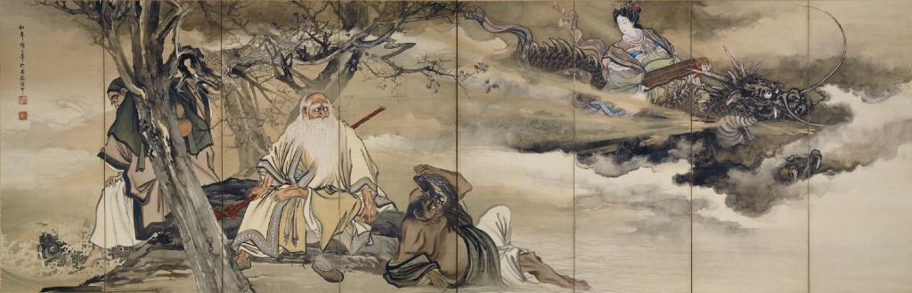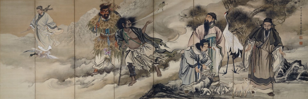 這是近代日本畫壇領導人物鈴木松年(1848-1918)的屏風大作,他是畫家鈴木百年(1828-1891)的長子,出生在京都四條堺町西。這件屏風的左右隻都達八曲,是罕見的大尺幅。右隻有六位仙人,右起依序為:能將石頭變成羊黃初平和他的兄長黃初起、與鶴相伴的控鶴仙人、從口中噴出小分身的李鐵拐,接著是穿著蓑衣,手持草花神農,以及降鳧化鞋的王喬。屏風的左隻也有四個仙人,左起是乘鯉的琴高仙人、留著白鬍子的黃石公、蛤蟆仙人,以及在天上乘龍的太真王夫人(西王母的女兒,名婉),她經常以抱琴乘龍的形象出現。