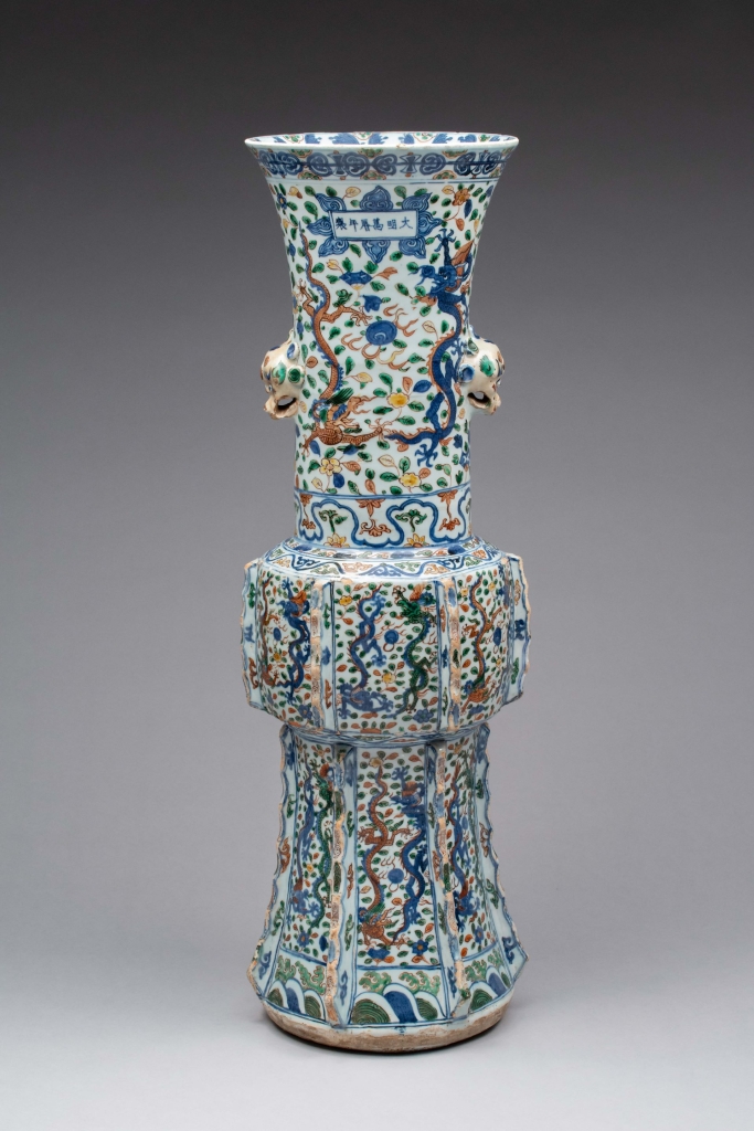 這是一件明代萬曆五彩的大型瓶,高達77公分。萬曆年間的景德鎮盛行仿製銅器的尊式瓶,如本件側面的翼狀棱脊便是受古代青銅器造型啟發。瓶頸的左右分別裝有獸面耳,其上開有孔。作為萬曆五彩,本作的紅色略顯黯淡,不過垂直成對的龍和花卉圖案,製造了華麗的視覺效果。這種華麗的裝飾可以說是萬曆樣式的特點,口沿附近帶框的年款和口沿內部的裝飾,讓它成為令人喜愛的佳作。