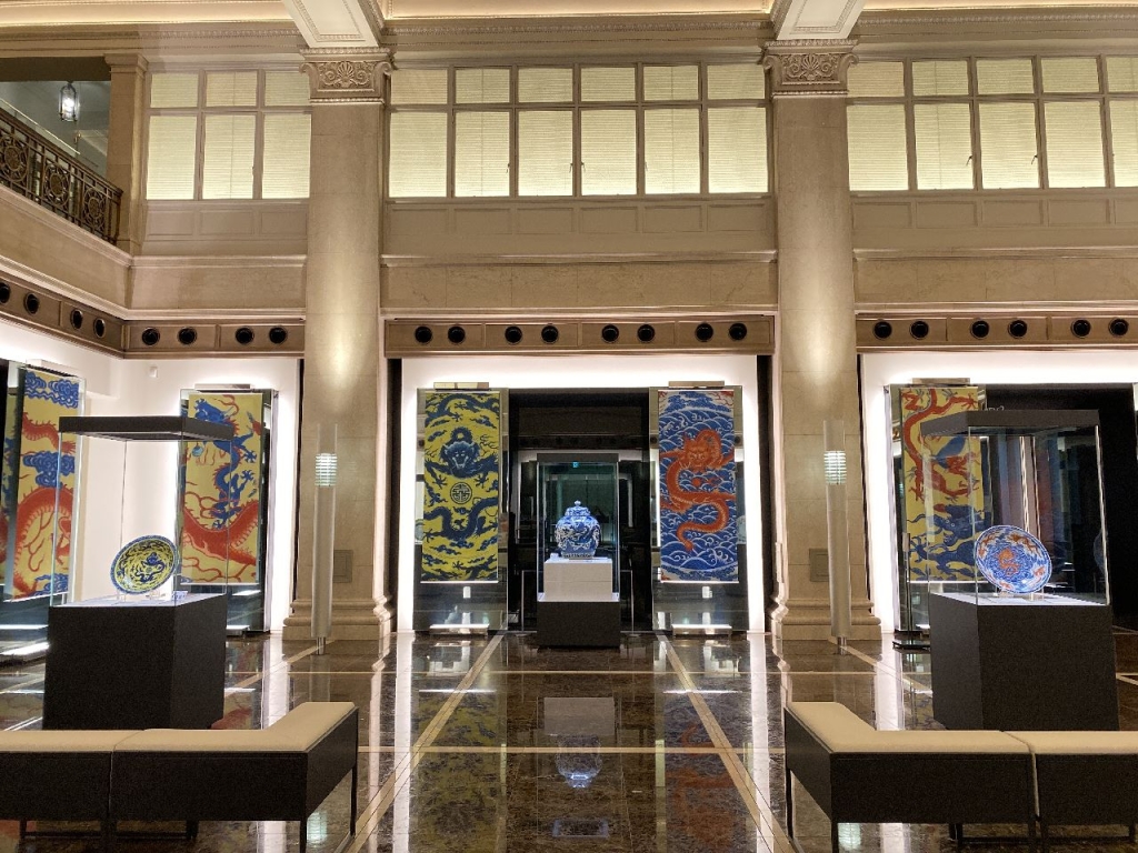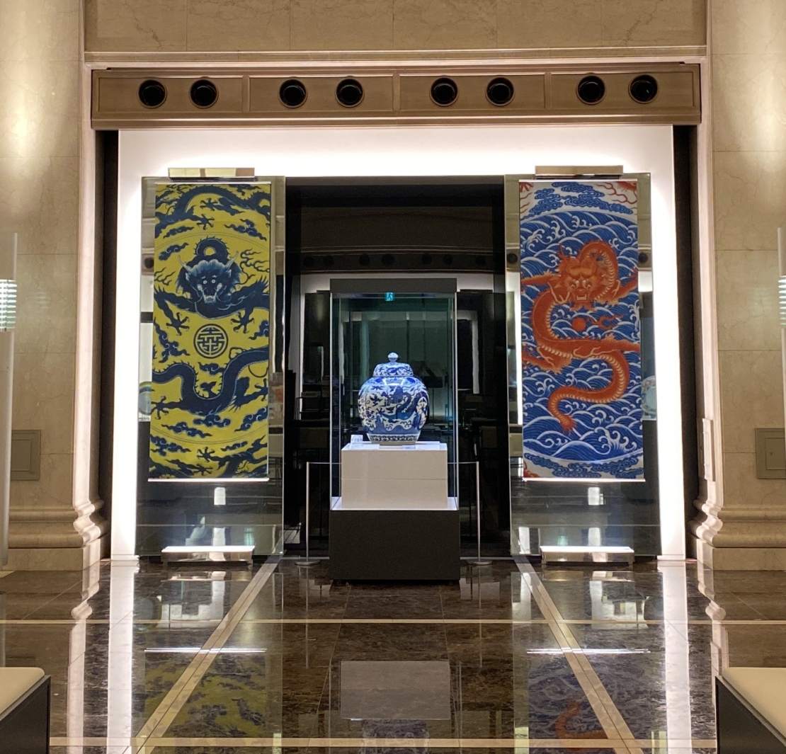「龍」這種想像中的生物誕生於古代中國,具有飛天、降雨的特殊能力,被視為強大和權力的象徵。不同於西方的龍帶有邪惡的色彩,東方將龍視為吉祥的靈獸。龍與中國的陰陽五行思想緊密相連,是四神之一(青龍、白虎、朱雀、玄武)。作為東西二方的守護神,很早以前就有「龍虎圖」的誕生。在藝術工藝品中,龍相關的圖騰還有翱翔於天的「雲龍圖」、現身於波濤的「龍濤圖」,與鳳凰搭配的「龍鳳圖」則有龍鳳呈祥的吉祥寓意,成為中國帝后的象徵。還有許多作品以龍的神話為基礎創作,或是「登龍門」、「畫龍點睛」等成語故事。諸如此類,龍以各種姿態在東亞藝術品中綻放光芒,藉由創作,東亞人民將祈願與喜愛注入龍的藝術品,與龍有著緊密的情感連結。在展廳中,我們規劃了四個主題,以下,我將循著各單元介紹展件。