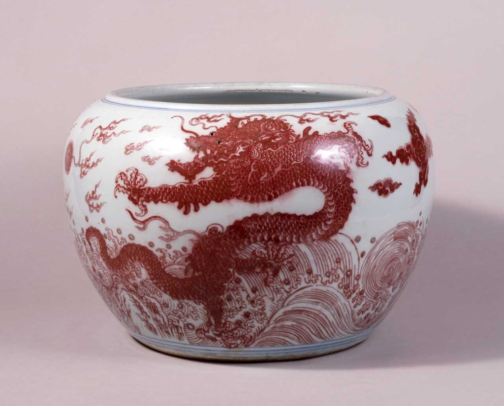 清代康熙年間,景德鎮官窯的燒製技術進展顯著,開發出一種以銅發色的紅釉瓷,以督陶官的姓氏命名為「郎窯紅」,使用 「釉下紅」的上釉方式,作品經燒製後經常泛灰,要成功顯出紅色相當困難。這件使用釉下紅的大型水缸,可以說是珍貴的成功案例。