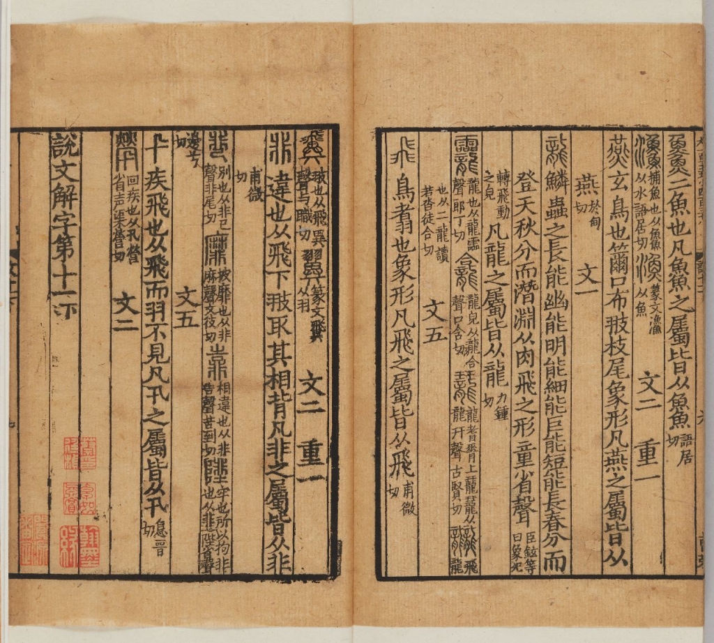 《說文解字》由東漢許慎編纂而成,是中國最古老、按部首分類的漢字辭典,使用了當時正式的字體──小篆。書中收錄了9353個漢字,以540個部首分類,對每個字的意義、字形結構和發音進行了解釋,被視為中國文字學的基本著作。靜嘉堂所藏《說文解字》是南宋初期的版本,為現存最早版本,因此非常珍貴。《說文解字》全八冊,這次展覽我們展示了第一冊的起始部分,以及第六冊中含有「龍」字的頁面: